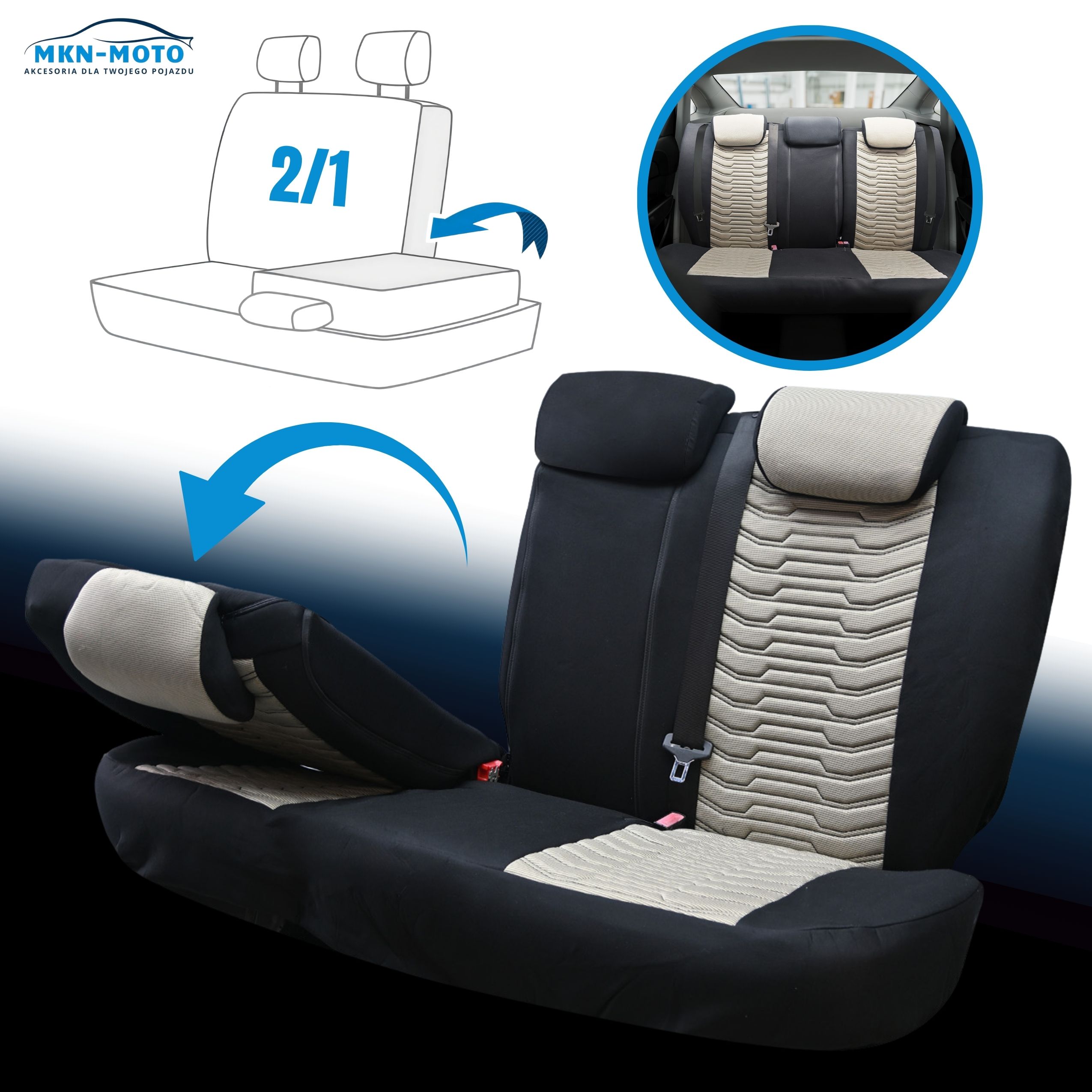 ✔️ Zestaw kompletny: przód, tylna kanapa dzielona 2/1, 5 zagłówków, kieszenie.