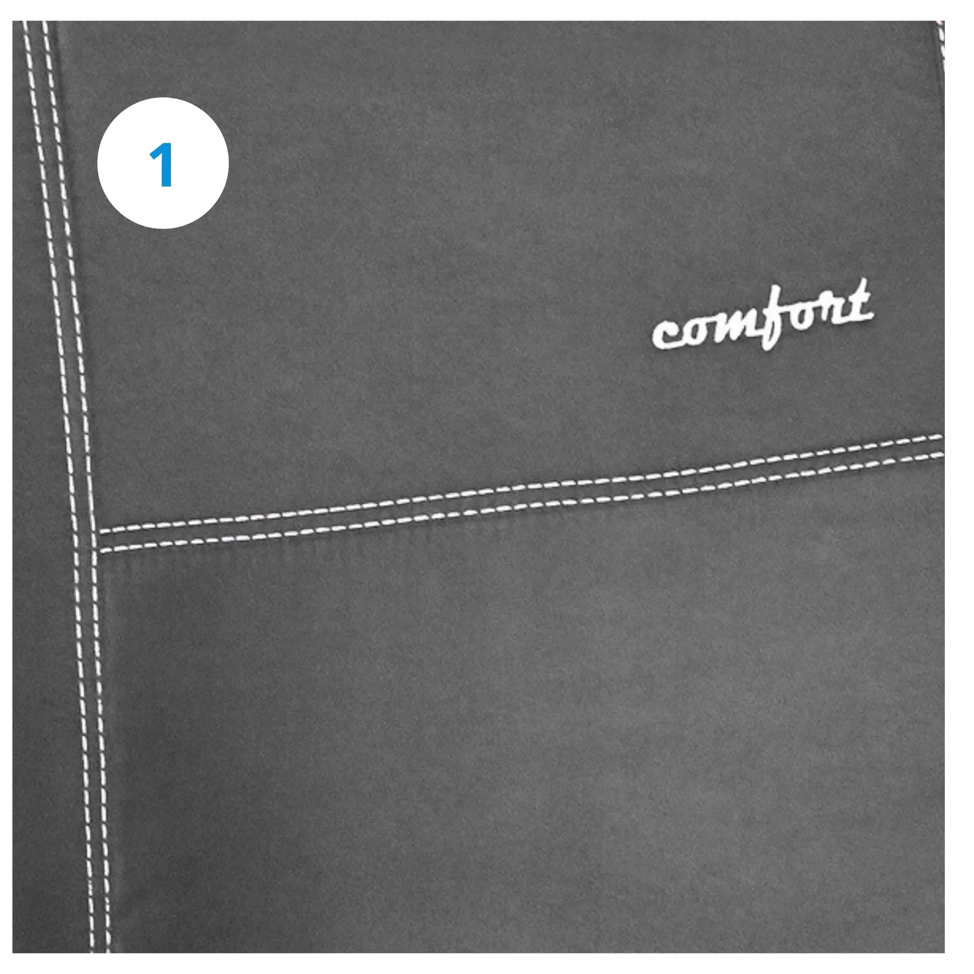 Pokrowce na siedzenia serii Comfort w przedniej części foteli wykonane zostały z wysokiej jakości syntetycznej odmiany zamszu - alkantary. Przednie fotele pokrowców dodatkowo zdobione są estetycznym napisem Comfort wykonanym za pomocą haftu komputerowego. Eleganckie przeszycia grubymi nićmi dodają pokrowcom trwałości, oraz wzmacniają łączenia materiałów.