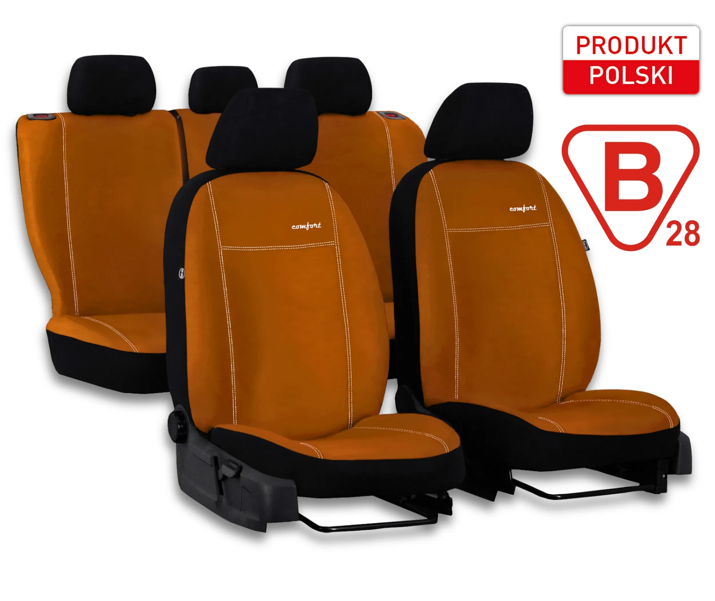 Pokrowce na siedzenia serii Comfort w przedniej części foteli wykonane zostały z wysokiej jakości syntetycznej odmiany zamszu - alkantary. Przednie fotele pokrowców dodatkowo zdobione są estetycznym napisem Comfort wykonanym za pomocą haftu komputerowego. Eleganckie przeszycia grubymi nićmi dodają pokrowcom trwałości, oraz wzmacniają łączenia materiałów.