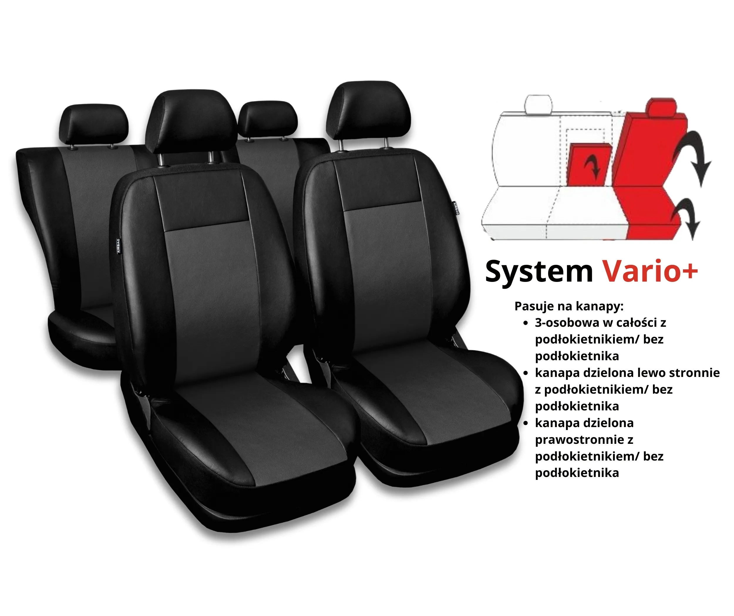 W pokrowcach zastosowany został system VARIO+. W tylnej kanapie zamontowano zamki błyskawiczne, dzięki którym można korzystać z najpopularniejszych na rynku dzieleń kanap (np. kanapa dzielona w całości 2/1, dzielone tylko oparcie a siedzisko całe i oczywiście wariant gdy cała kanapa stanowi jeden element).