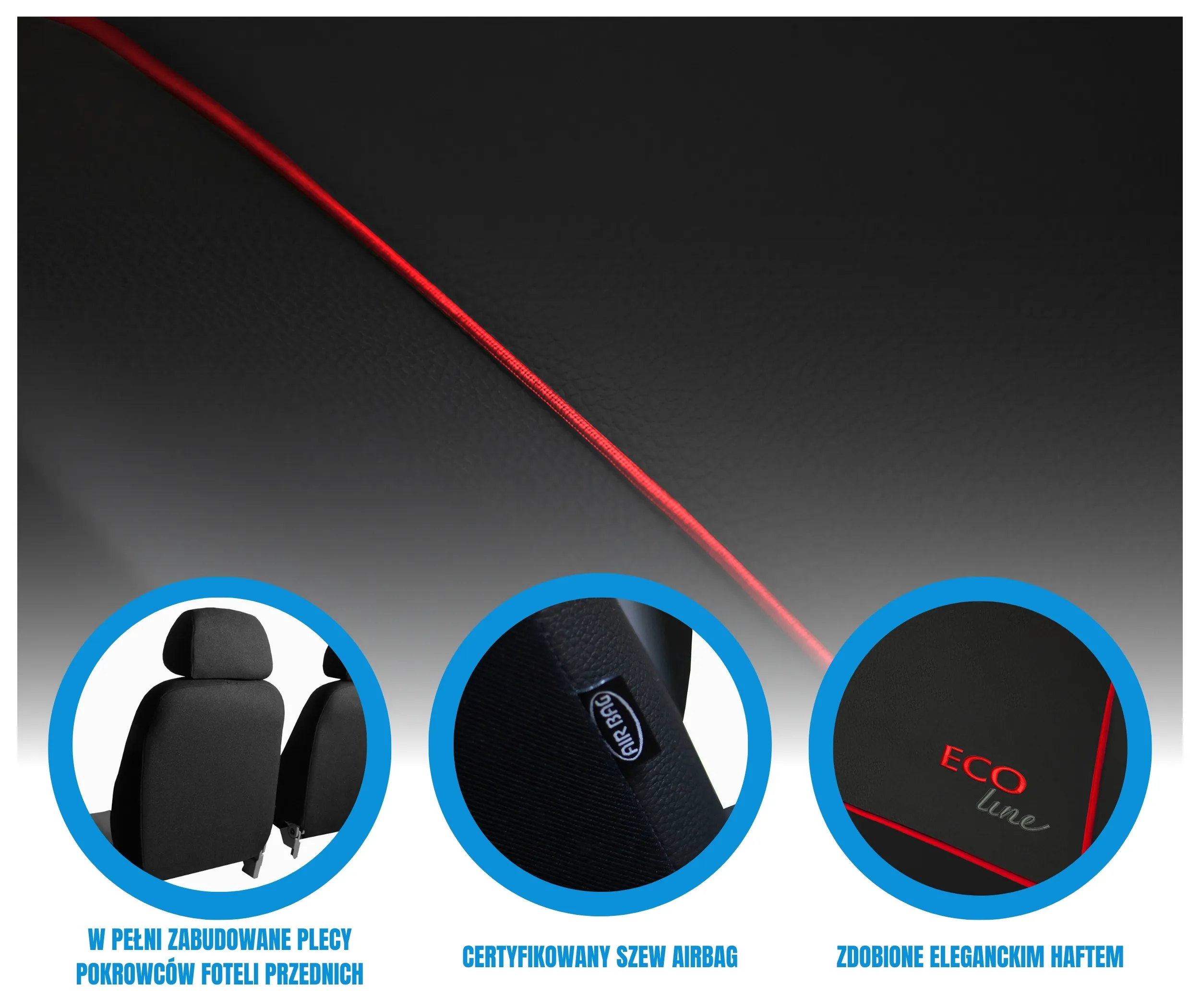 Pokrowce na siedzenia serii Eco-Line wykonane zostały ze skóry ekologicznej w zestawie z elegancką lamówką w wielu kolorach do wyboru, oraz estetycznym napisem wykonanym w technice haftu komputerowego zachowanego w jednakowej tonacji. Zastosowana lamówka nadaje pokrowcom niepowtarzalny design oraz zwiększa ich wytrzymałość.