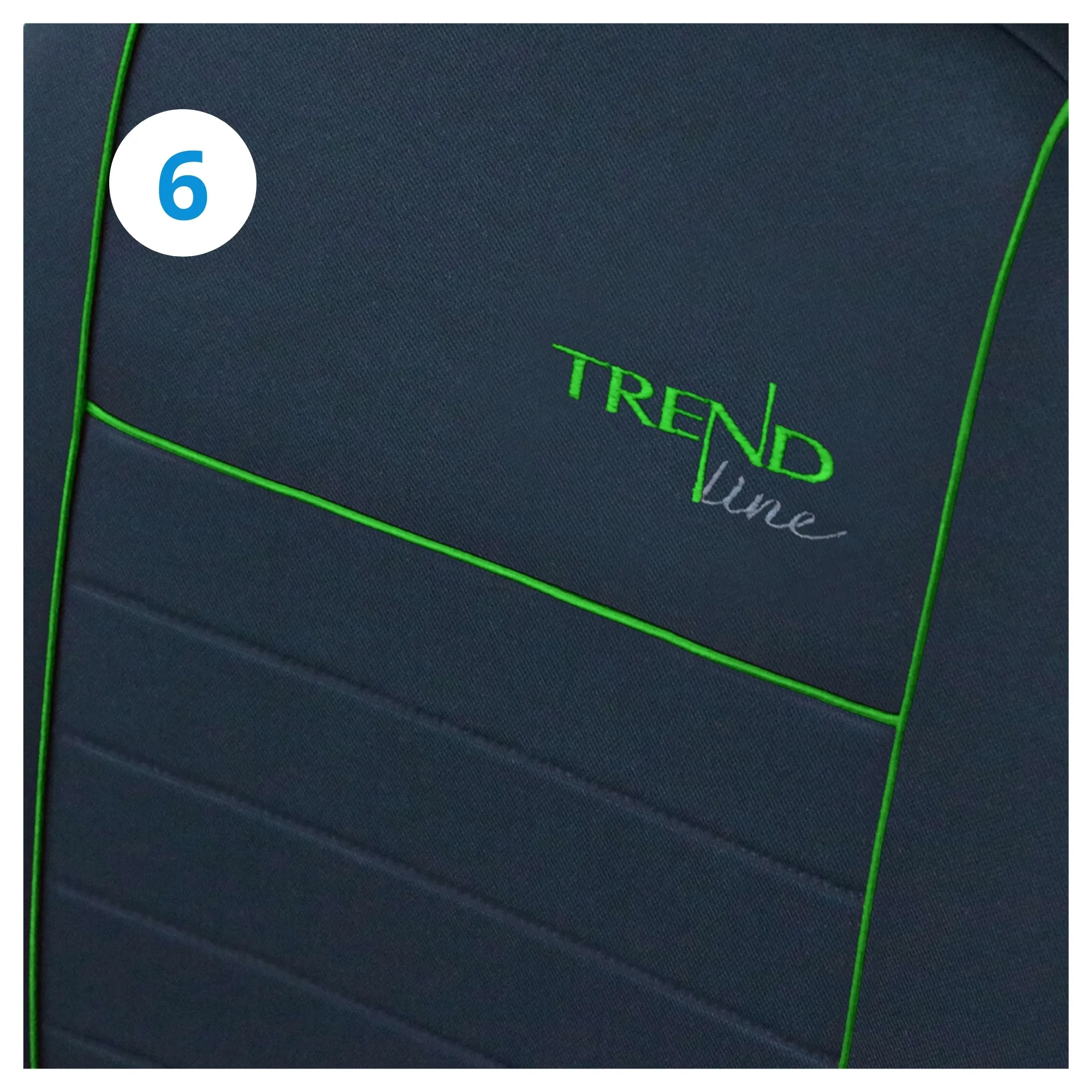 Przednia część pokrowców ozdobiona została elegancką lamówką, która zwiększa ich wytrzymałość oraz estetycznym napisem Trend Line wykonanym w technice haftu komputerowego.
