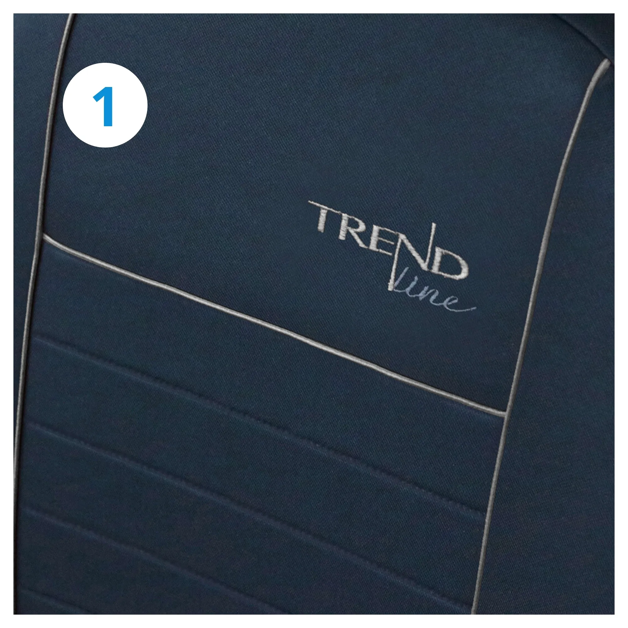Przednia część pokrowców ozdobiona została elegancką lamówką, która zwiększa ich wytrzymałość oraz estetycznym napisem Trend Line wykonanym w technice haftu komputerowego.