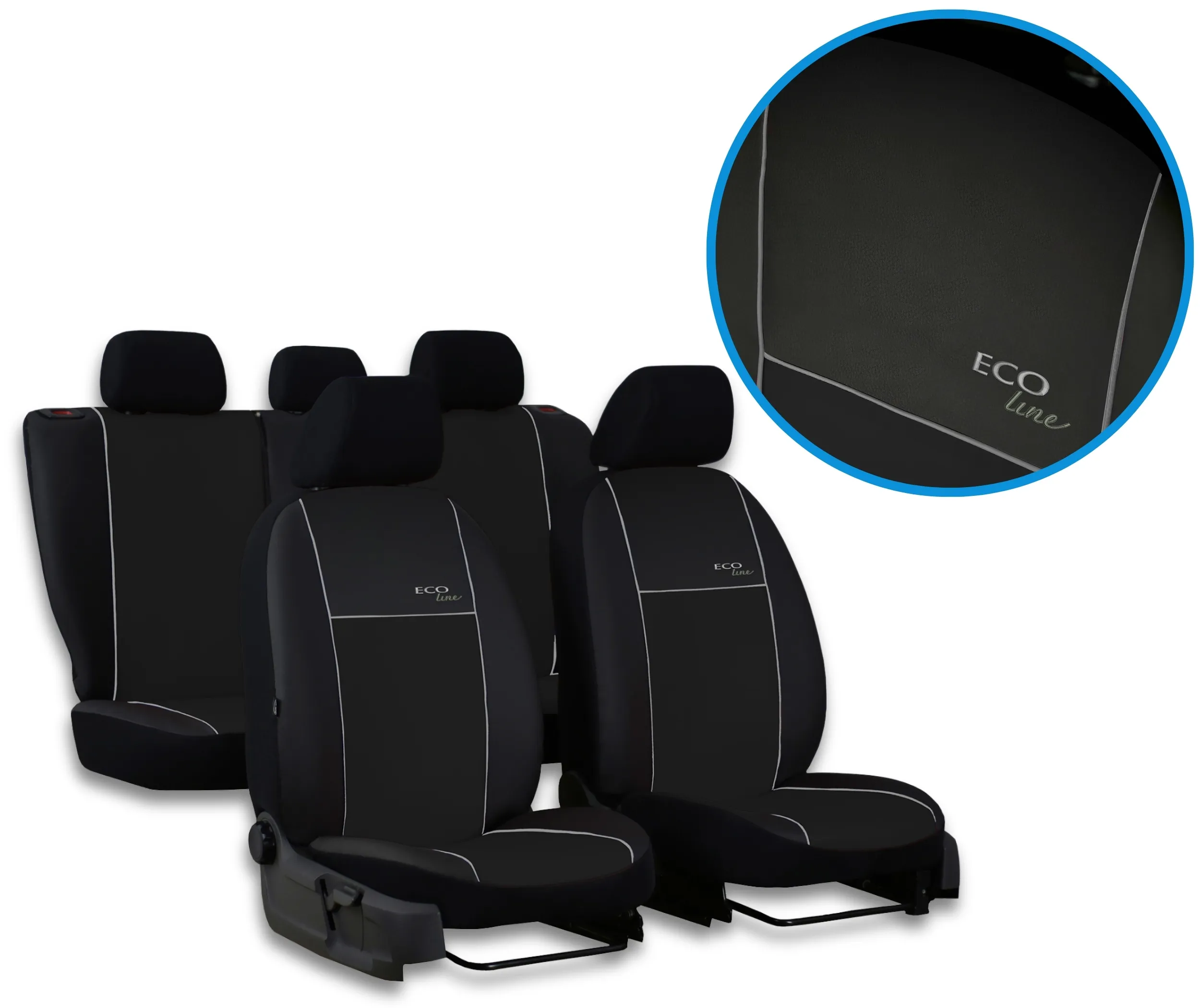 W pokrowcach Eco-Line zastosowano wysokiej jakości materiał imitujący skórę (Eko skóra) z lamówką wzmacniającą w różnych kolorach do wyboru. Całość podszyta jest pianką, która zapobiega przesuwaniu się pokrowców względem foteli podczas wsiadania oraz wysiadania. Miejsca podatne na przetarcia zostały wzmocnione podszewką, co zapobiega szybszemu przetarciu się.