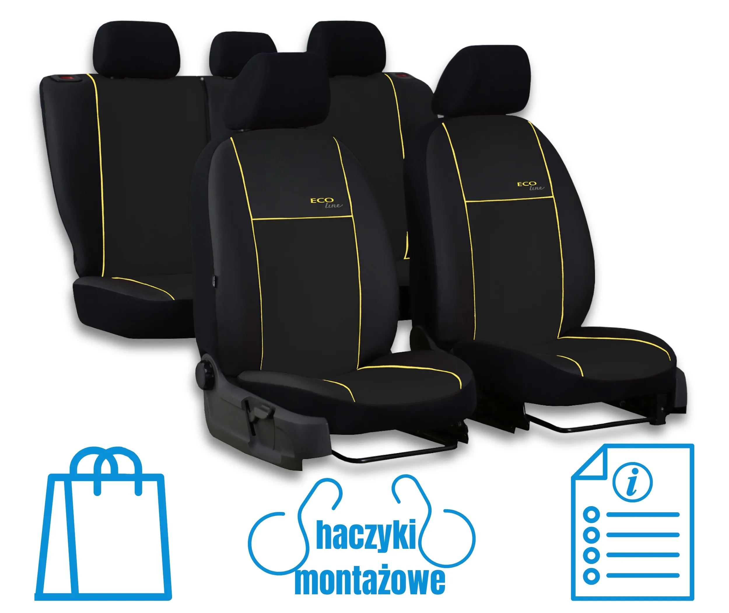 W pokrowcach Eco-Line zastosowano wysokiej jakości materiał imitujący skórę (Eko skóra) z lamówką wzmacniającą w różnych kolorach do wyboru. Całość podszyta jest pianką, która zapobiega przesuwaniu się pokrowców względem foteli podczas wsiadania oraz wysiadania. Miejsca podatne na przetarcia zostały wzmocnione podszewką, co zapobiega szybszemu przetarciu się.