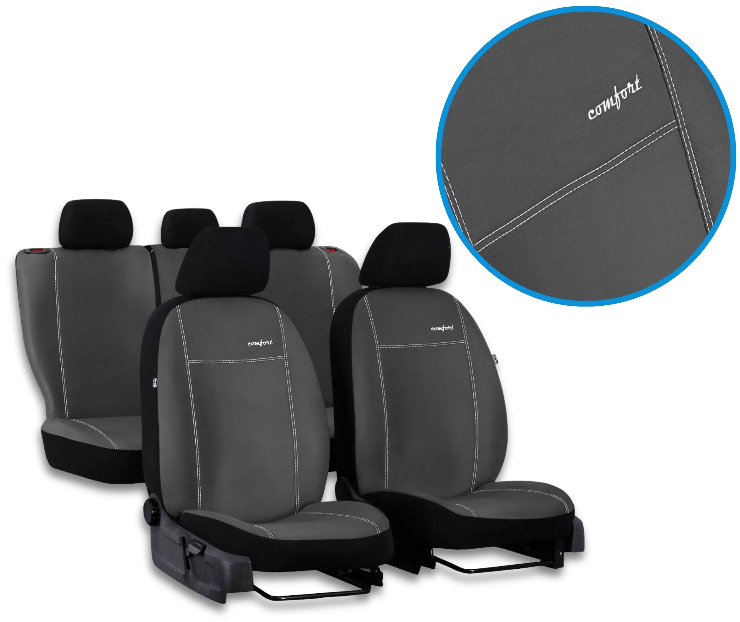 Pokrowce na siedzenia serii Comfort w przedniej części foteli wykonane zostały z wysokiej jakości syntetycznej odmiany zamszu - alkantary. Przednie fotele pokrowców dodatkowo zdobione są estetycznym napisem Comfort wykonanym za pomocą haftu komputerowego. Eleganckie przeszycia grubymi nićmi dodają pokrowcom trwałości, oraz wzmacniają łączenia materiałów.