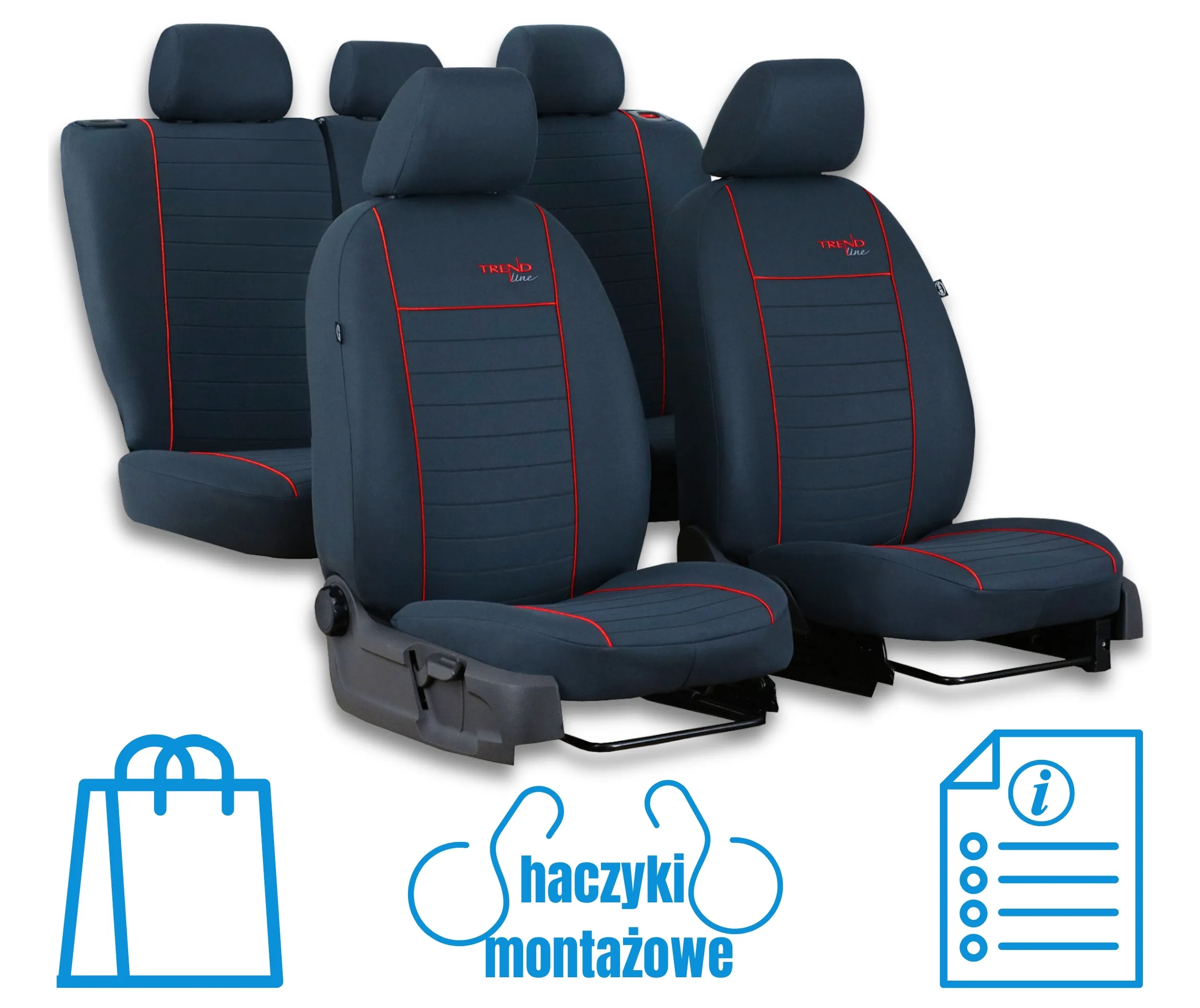 Przednia część pokrowców ozdobiona została elegancką lamówką, która zwiększa ich wytrzymałość oraz estetycznym napisem Trend Line wykonanym w technice haftu komputerowego.