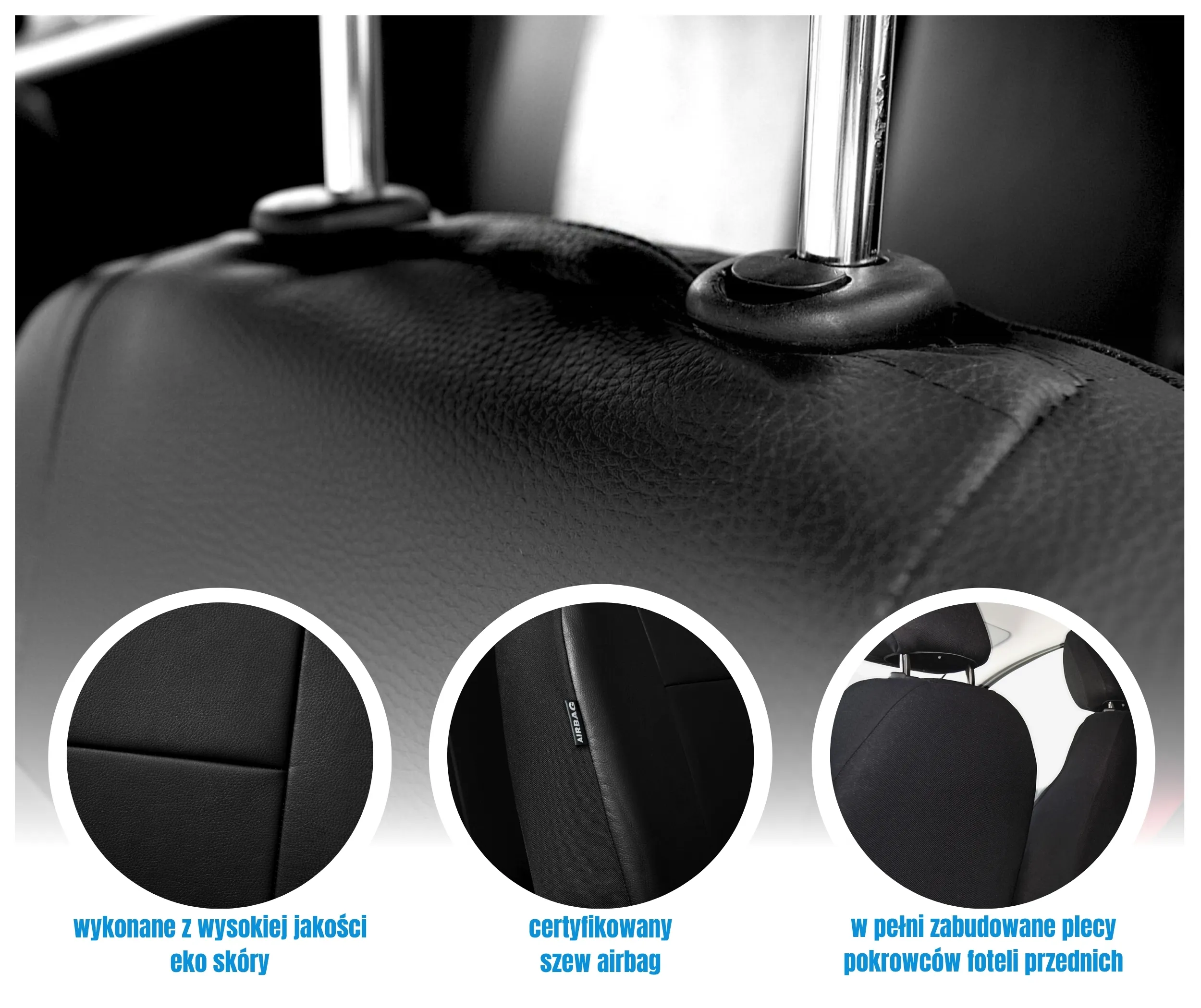 W zestawie znajduje się komplet pokrowców na zagłówki. W przednich fotelach zastosowane zostały regulowane rzepy, dzięki czemu nie ma potrzeby wykonywania otworów.