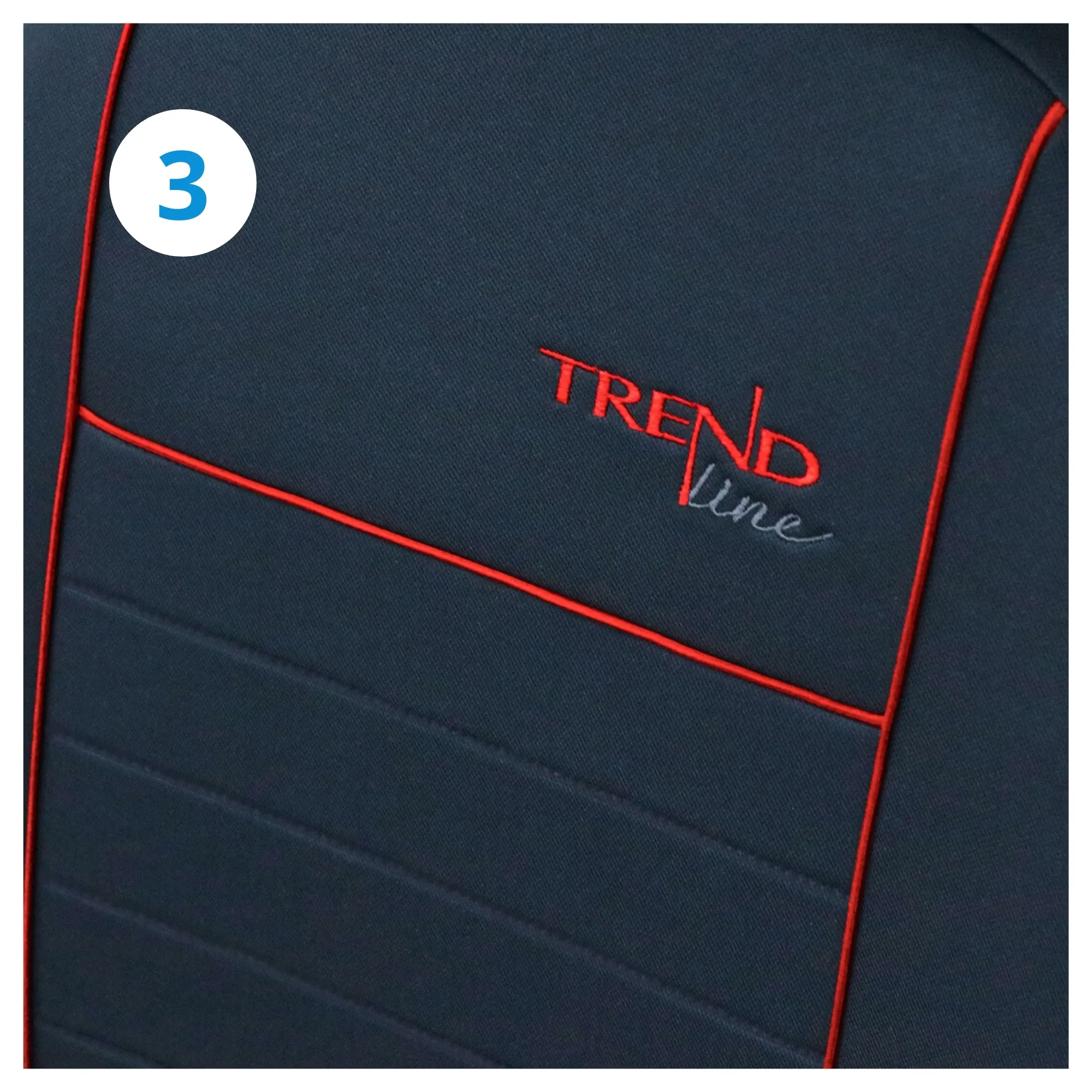 Przednia część pokrowców ozdobiona została elegancką lamówką, która zwiększa ich wytrzymałość oraz estetycznym napisem Trend Line wykonanym w technice haftu komputerowego.