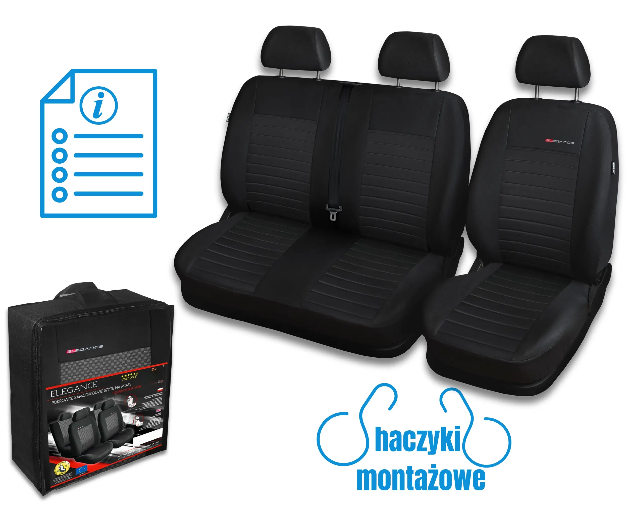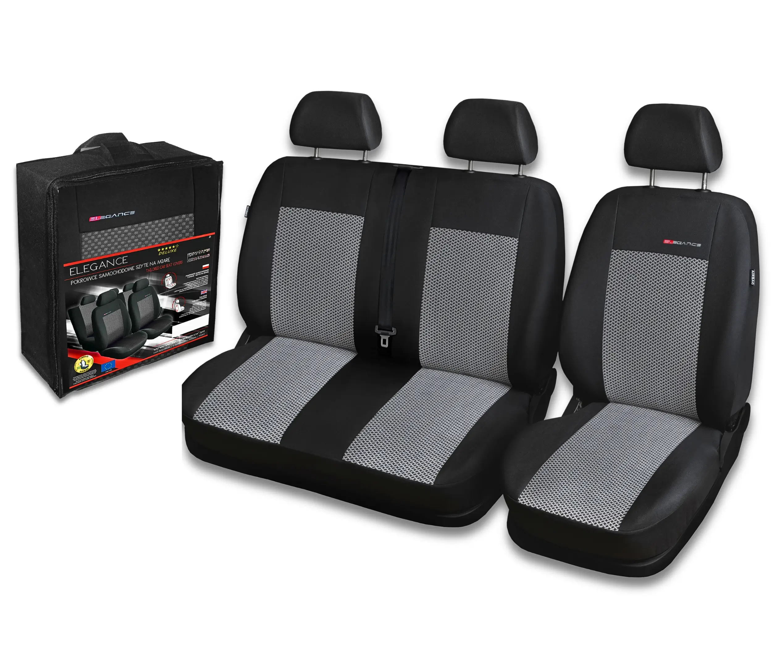 Dedykowane pokrowce samochodowe ELEGANCE są w całości szytę na miarę do danego modelu samochodu, dzięki czemu są one w 100% dopasowane do oryginalnej tapicerki.W zestawie znajduje się komplet pokrowców na zagłówki. W samochodach posiadających kieszenie w fotelach, czy też rozkładane stoliki / półki, pokrowce posiadają wszyte zamki błyskawiczne umożliwiające prawidłowy ich montaż oraz bezproblemowe korzystanie z w.w. elementów.