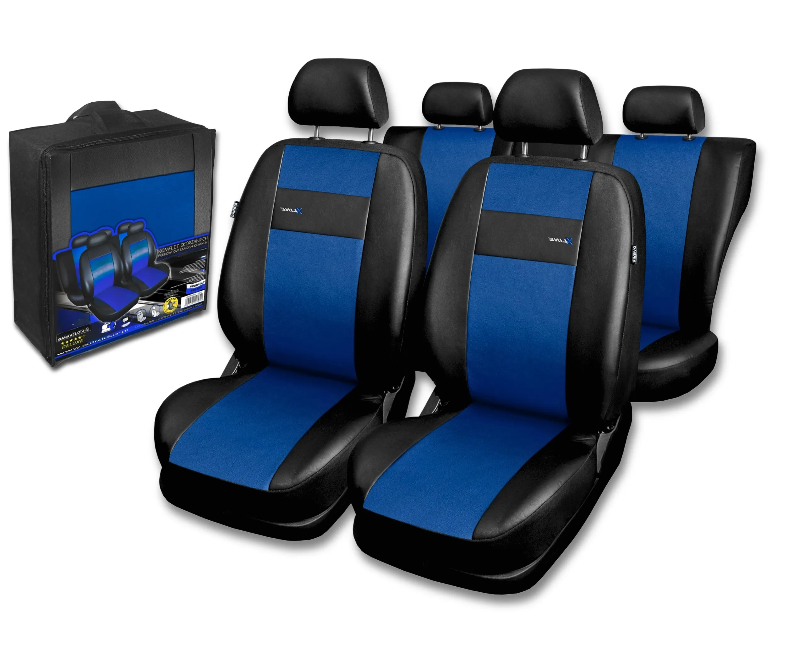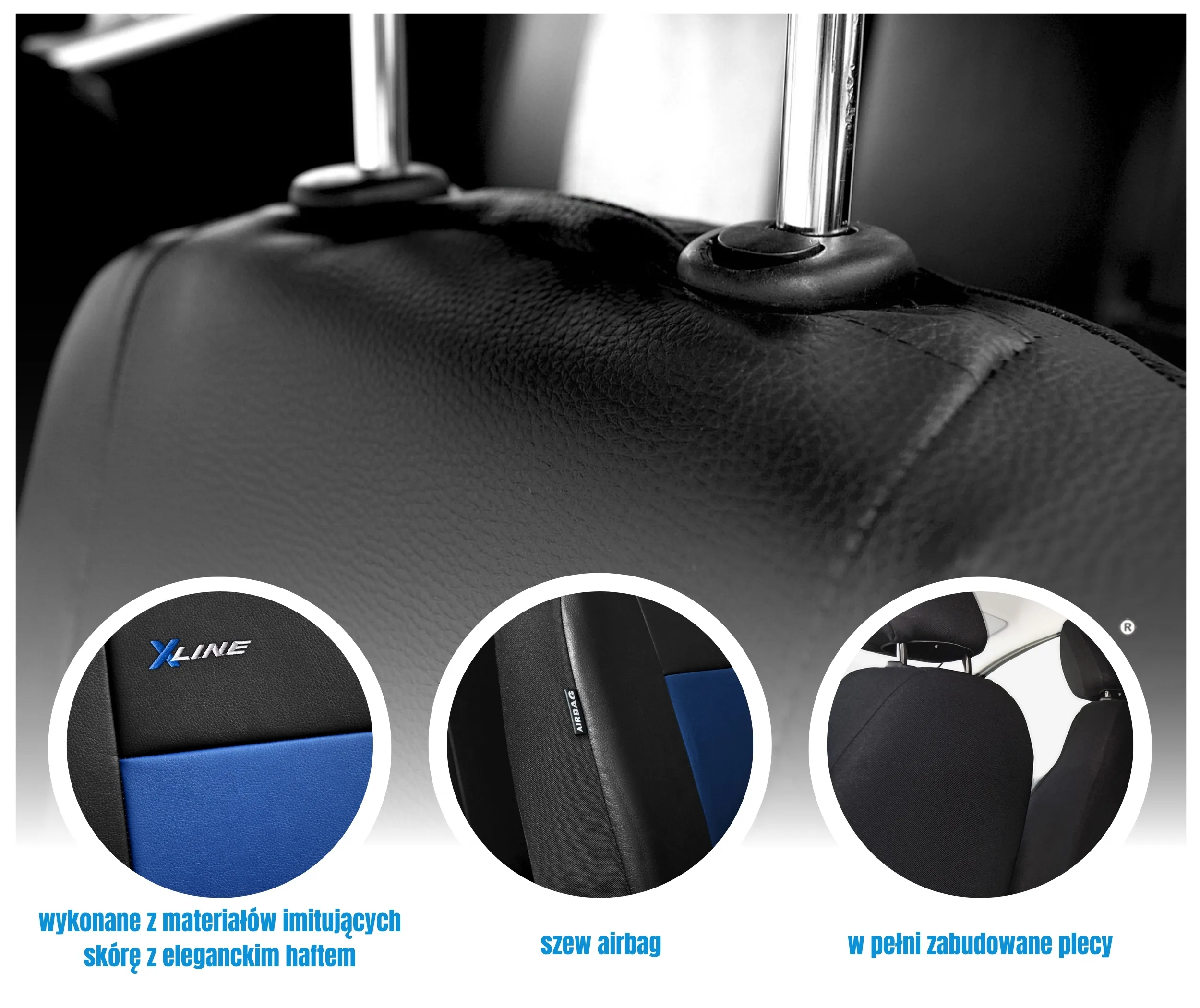 W przedniej części pokrowców X-LINE, użyte zostały wysokiej jakości materiał imitujący skórę (Eko skóra) z fakturą skóry naturalnej. Całość pokrowców podszyta jest pianką, która zapobiega przesuwaniu się pokrowców względem foteli podczas wsiadania oraz wysiadania. Miejsca podatne na przetarcia zostały wzmocnione podszewką, co zapobiega szybszemu przetarciu się pokrowców.