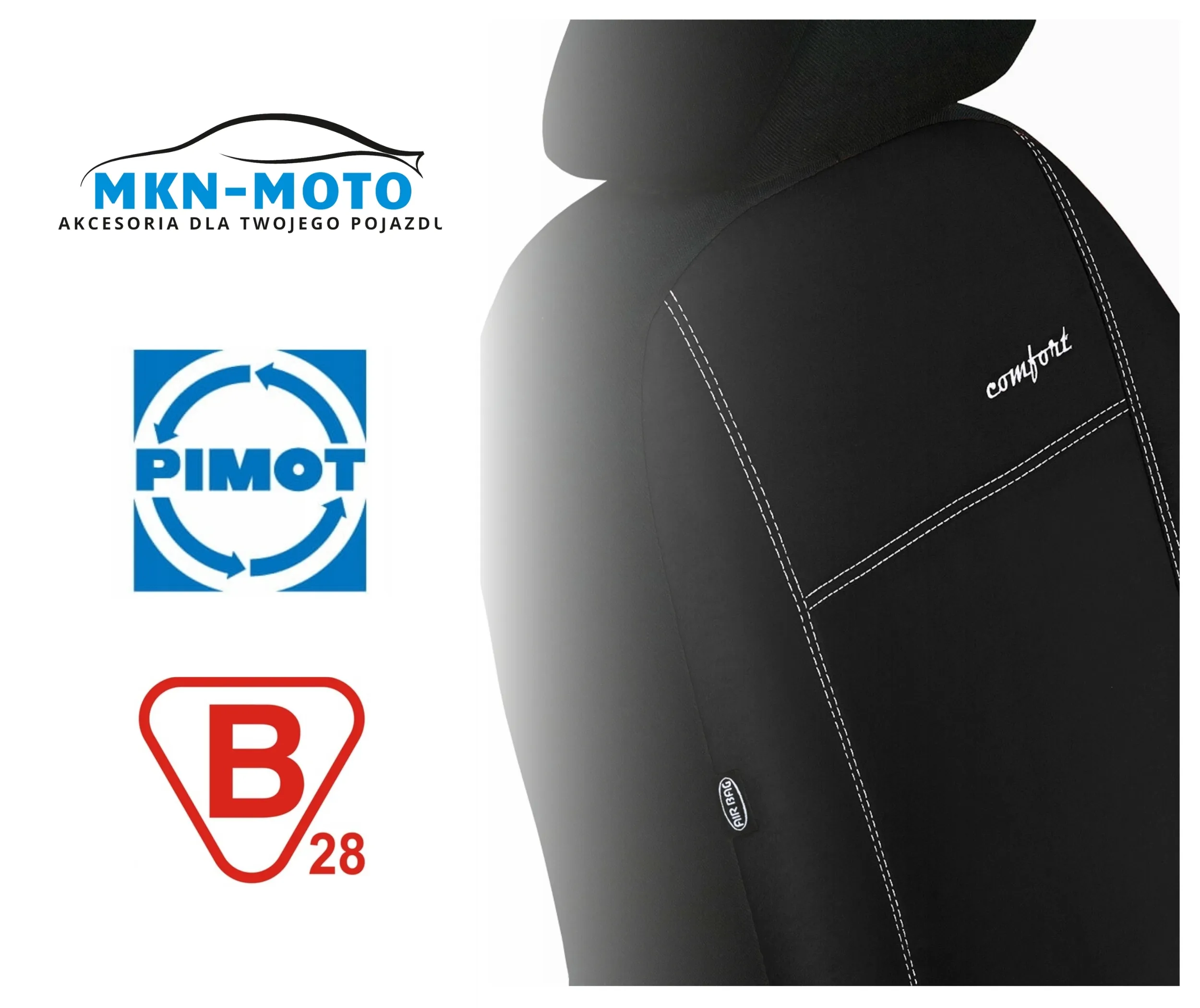 Pokrowce na siedzenia serii Comfort w przedniej części foteli wykonane zostały z wysokiej jakości syntetycznej odmiany zamszu - alkantary. Przednie fotele pokrowców dodatkowo zdobione są estetycznym napisem Comfort wykonanym za pomocą haftu komputerowego. Eleganckie przeszycia grubymi nićmi dodają pokrowcom trwałości, oraz wzmacniają łączenia materiałów.