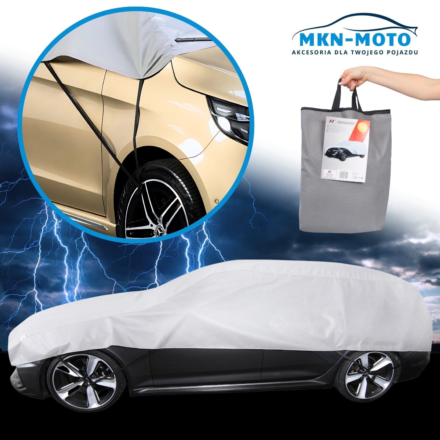 Aby zapewnić stabilność i bezpieczeństwo nawet podczas silnych podmuchów wiatru, pokrowiec wyposażony jest w system 5-punktowego mocowania. Eastyczne gumy dopasowują się pokrowiec do kształtu samochodu, zapobiegając przypadkowemu zsuwaniu się lub porwaniu pokrowca podczas burzy. W zestawie znajduje się również praktyczna torba do przechowywania, dzięki czemu pokrowiec możesz zawsze mieć pod ręką i szybko założyć w razie potrzeby.