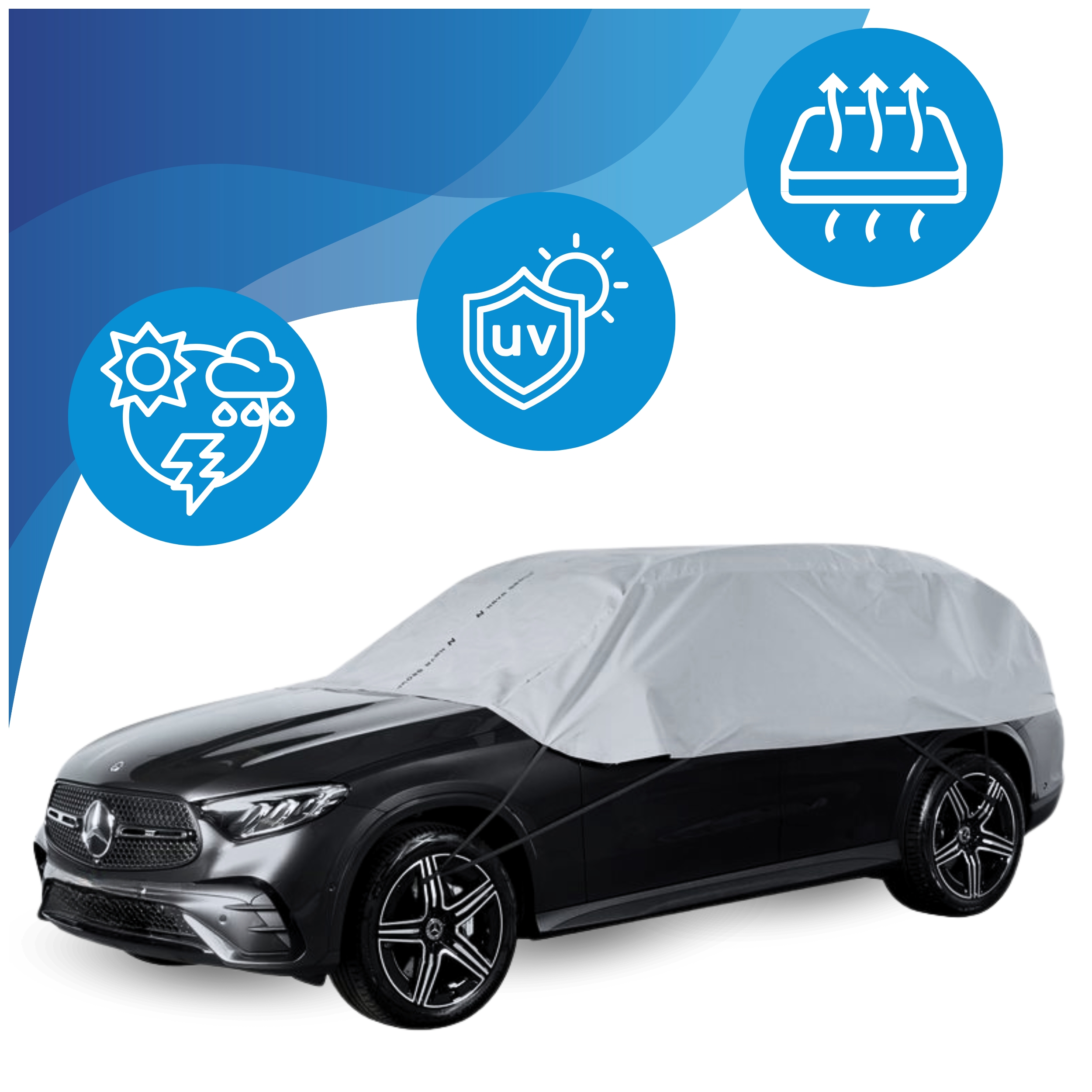 ✔️ Ochrona przed promieniowaniem UV - Materiał półpokrowca wyposażony jest w filtr chroniący przed szkodliwym oddziaływaniem promieni słonecznych, co pomaga ograniczyć blaknięcie lakieru oraz elementów wnętrza pojazdu.