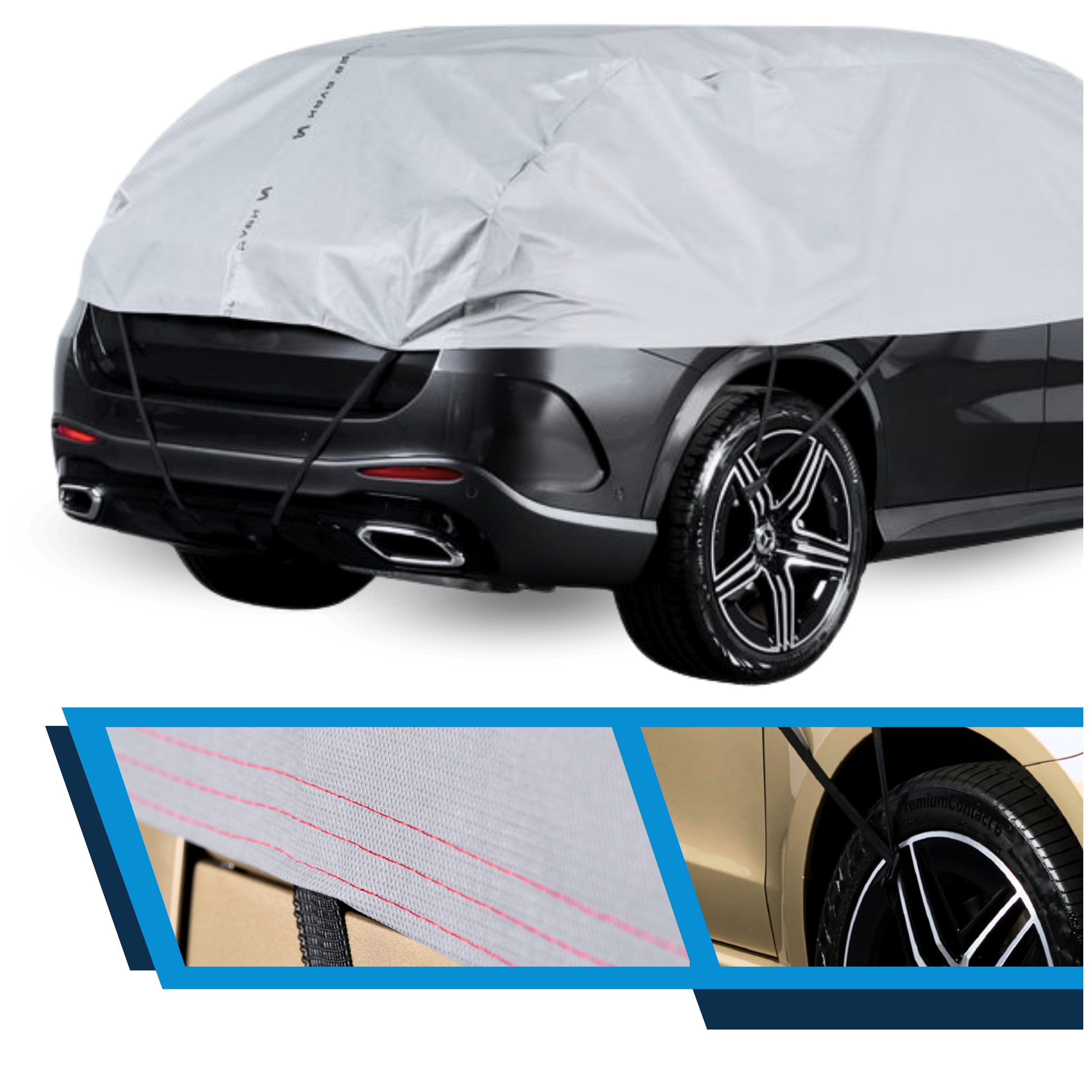 ✔️ Wodoodporność górnej części - Górna warstwa półpokrowca wykonana jest z materiału o właściwościach wodoszczelnych i wodoodpornych, co ogranicza przedostawanie się wody do wnętrza osłony i chroni pojazd podczas postoju.