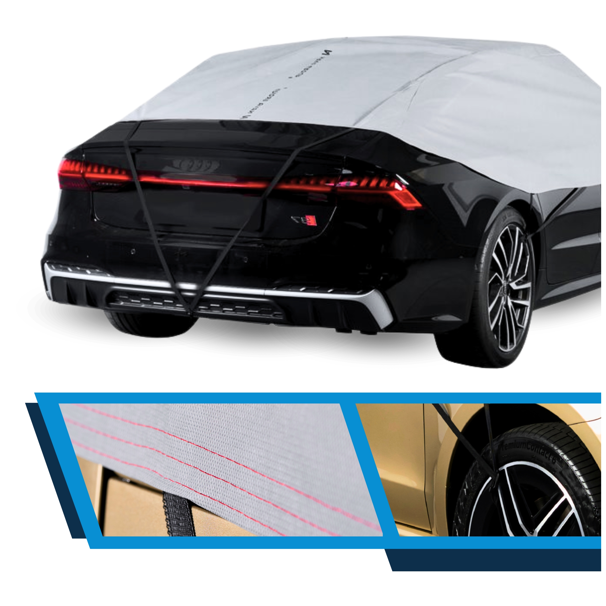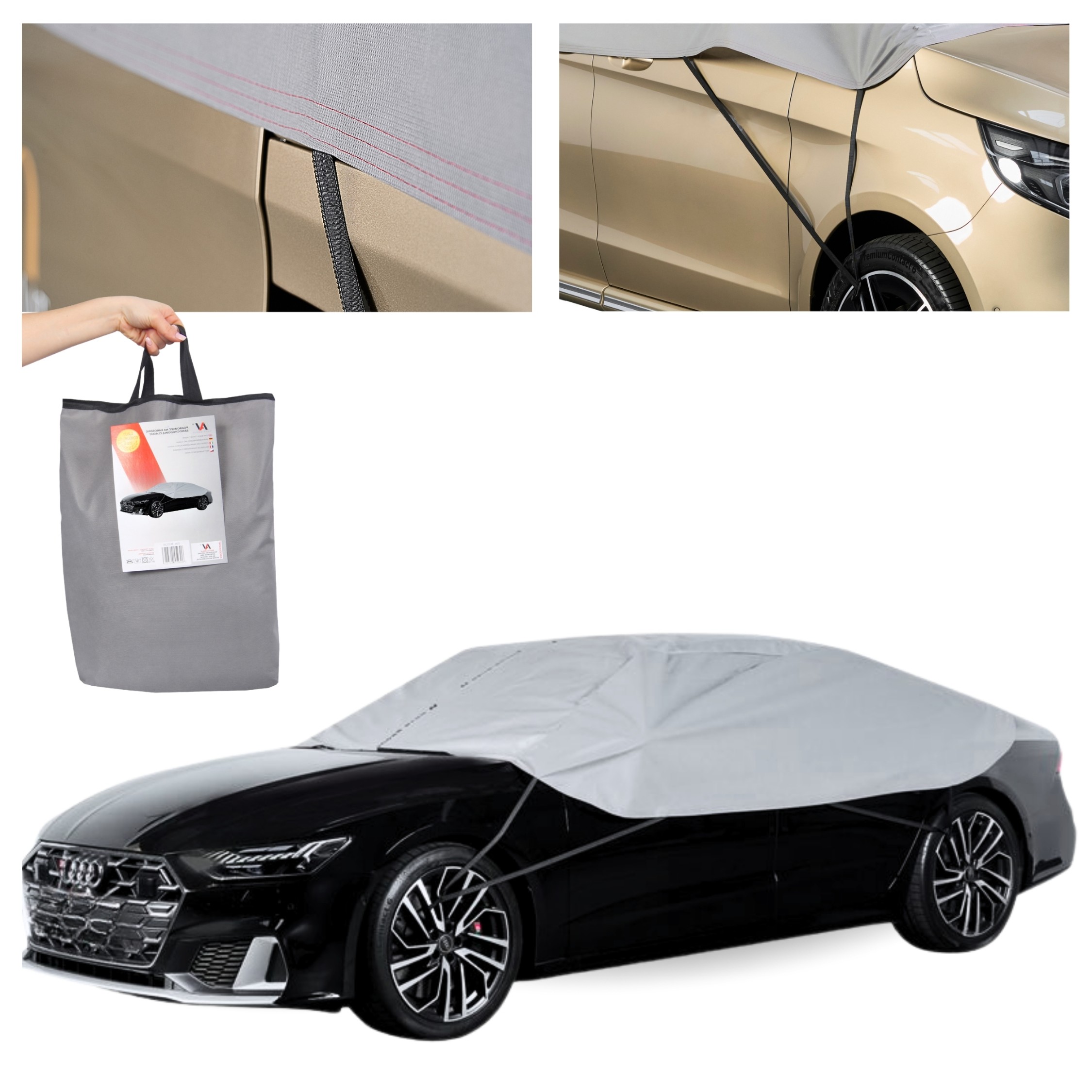 ✔️ Wodoodporność górnej części - Górna warstwa półpokrowca wykonana jest z materiału o właściwościach wodoszczelnych i wodoodpornych, co ogranicza przedostawanie się wody do wnętrza osłony i chroni pojazd podczas postoju.