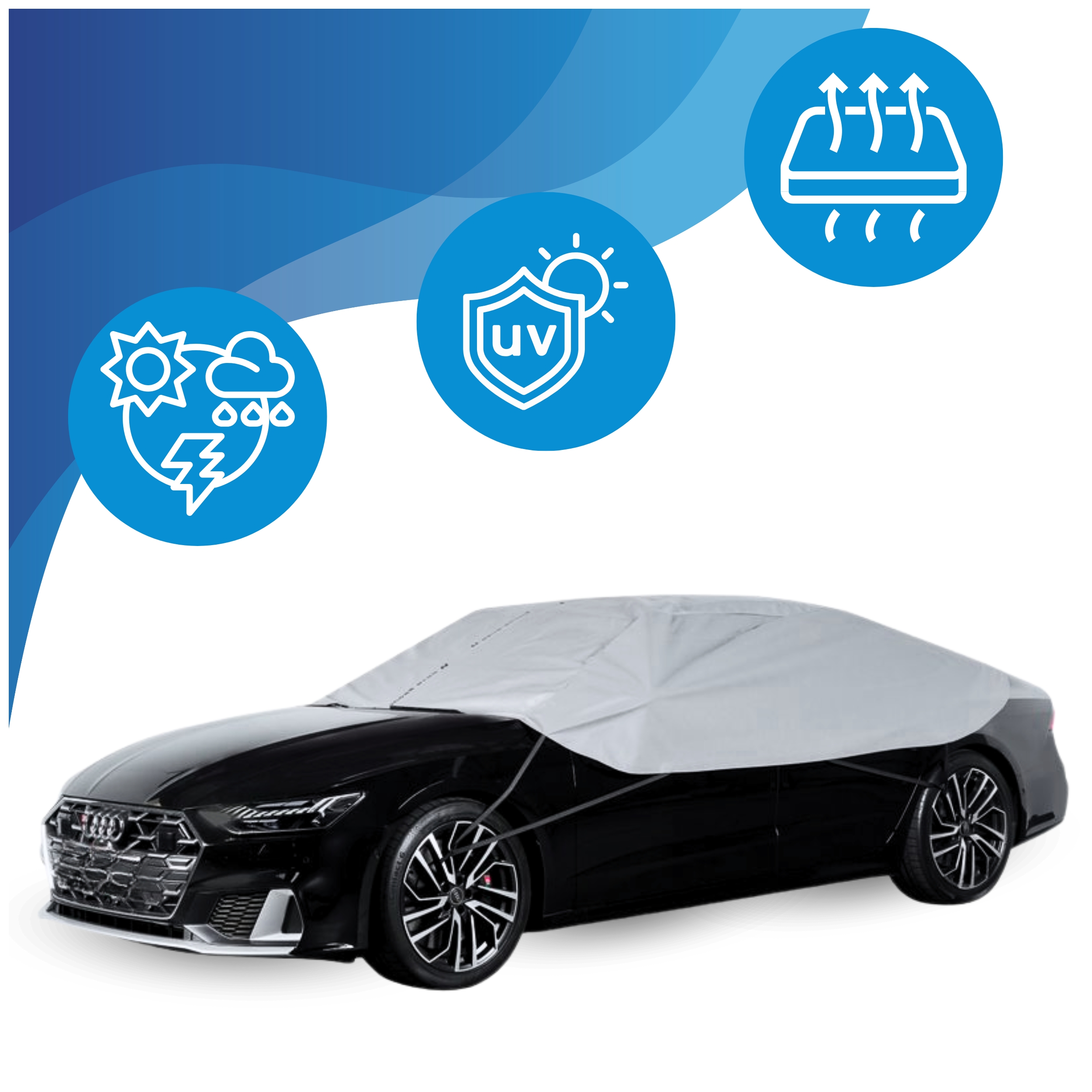Warstwa zewnętrzna o właściwościach wodoodpornych i paroprzepuszczalnych chroni pojazd przed oddziaływaniem czynników atmosferycznych. Warstwa wewnętrzna, bezpośrednio przylegająca do karoserii, wykonana jest z polipropylenu i została zaprojektowana z myślą o bezpiecznym kontakcie z powierzchnią pojazdu. Górna część półpokrowca zapobiega przedostawaniu się wody, natomiast boki o wysokiej paroprzepuszczalności odprowadzają nadmiar wilgoci spod osłony. Wbudowany filtr UV wspiera trwałość materiału.