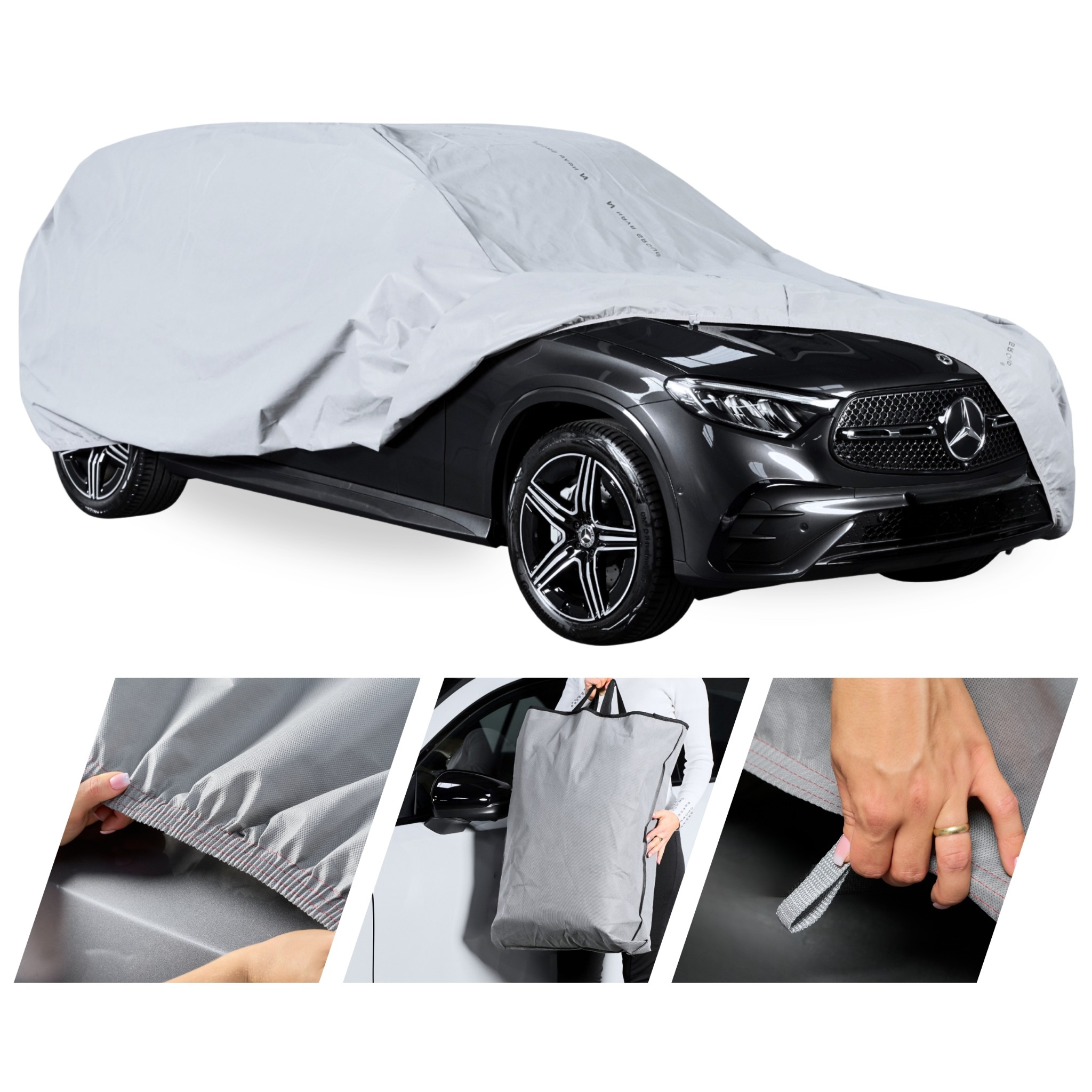 Pokrowiec w kolorze szarym skutecznie odbija promienie słoneczne, zapobiegając przegrzewaniu się materiału i wnętrza pojazdu. Dodatkowo, zastosowany filtr UV zapewnia długotrwałą ochronę, bez efektu strzępienia i pękania materiału.