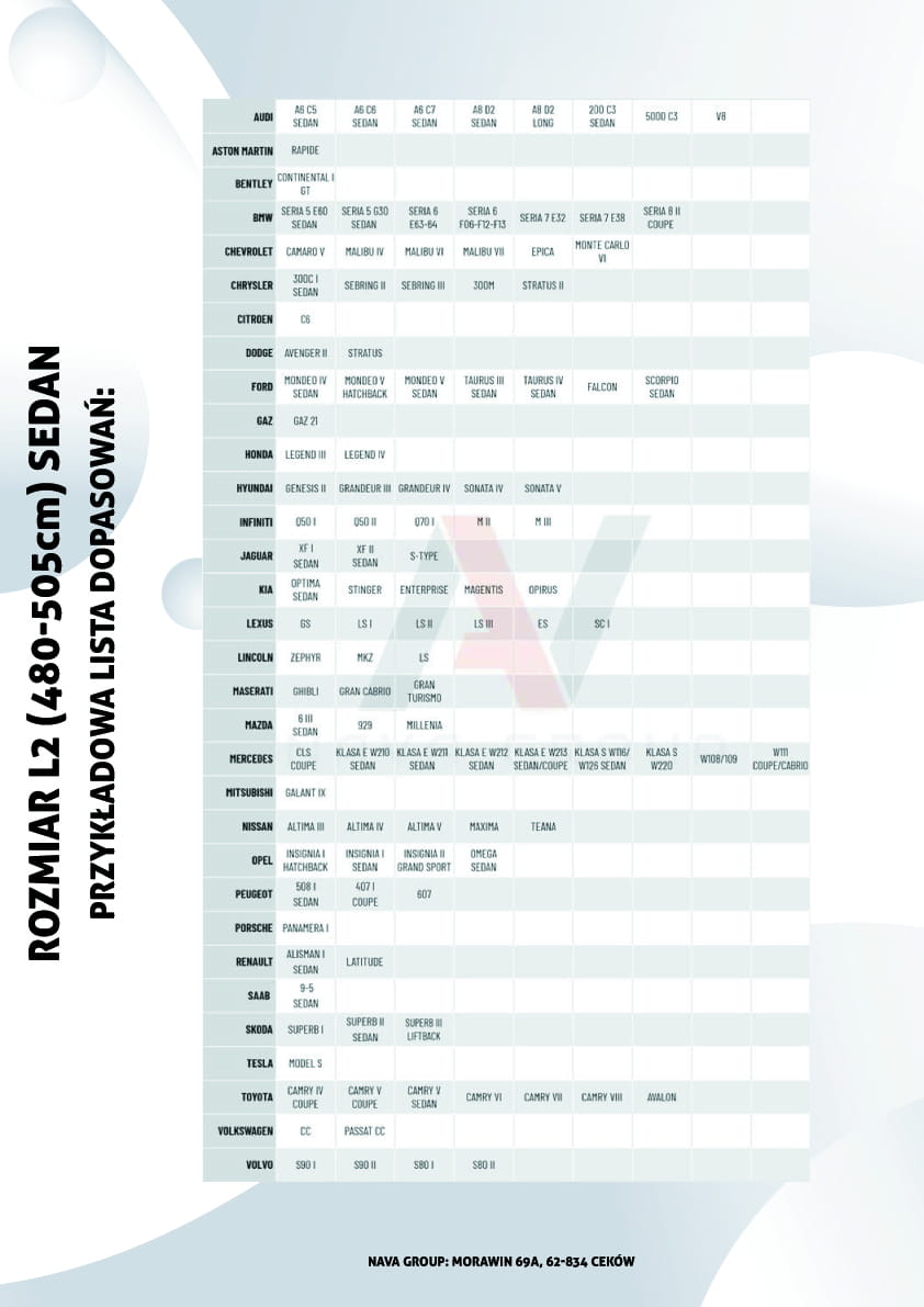 | Dane techniczne: Rozmiar pokrowca: L2S 480-505cm Typ nadwozia: sedan | ![]() |