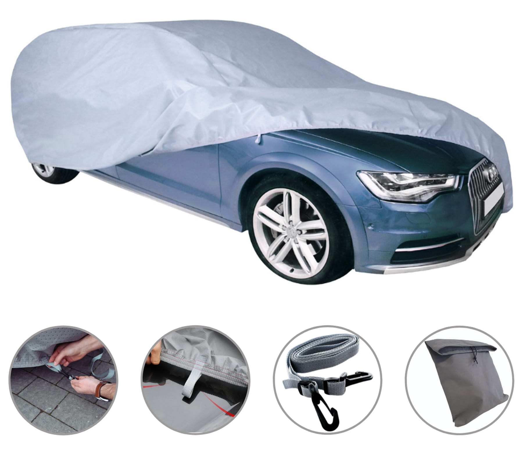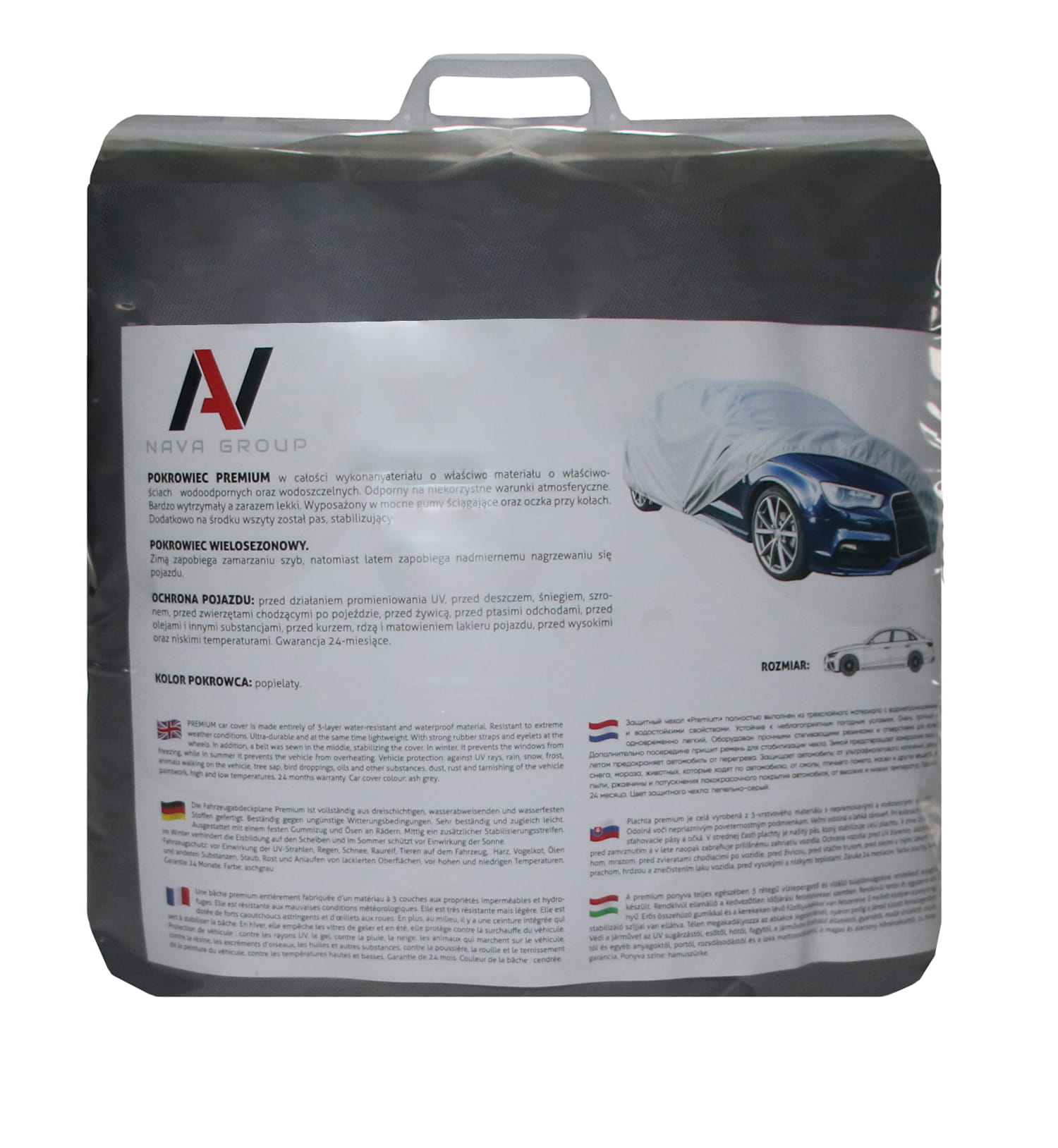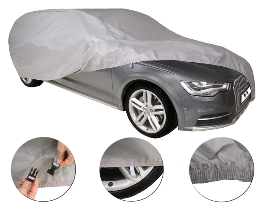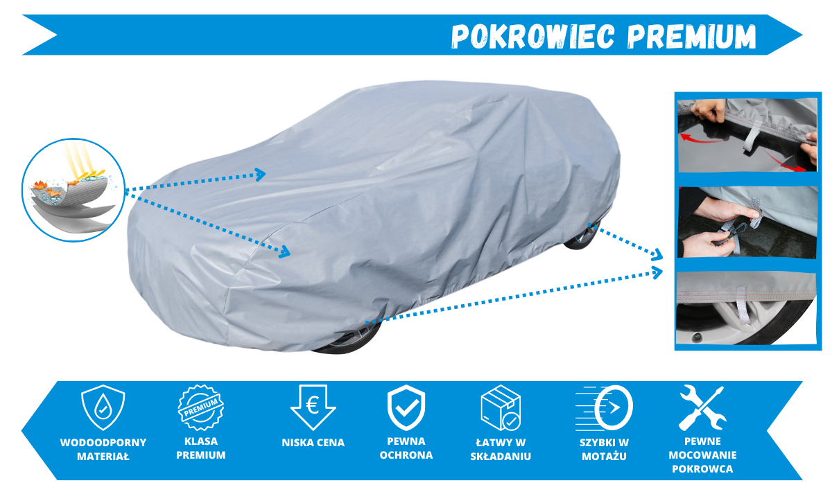 POKROWIEC PREMIUMWykonany z bezpiecznych dla lakieru materiałów, odpornych na niekorzystne warunki atmosferyczne. Bardzo wytrzymały a zarazem lekki. Pokrowiec w całości wodoodporny. Łatwe zakładanie oraz zdejmowanie pokrowca. Wyposażony w mocne gumy ściągające oraz oczka przy kołach. W zestawie znajdują się pasy stabilizujące pokrowiec. POKROWIEC WIELOSEZONOWY. Zimą zapobiega zamarzaniu szyb, natomiast latem zapobiega nadmiernemu nagrzewaniu się pojazdu. OCHRONA POJAZDU: przed działaniem promieniowania UV, przed deszczem, śniegiem, szronem, przed zwierzętami chodzącymi po pojeździe, przed żywicą, przed ptasimi odchodami, przed olejami i innymi substancjami, przed kurzem, rdzą i matowieniem lakieru pojazdu, przed wysokimi oraz niskimi temperaturami. Gwarancja 24-miesiące. KOLOR POKROWCA: popielaty. | |