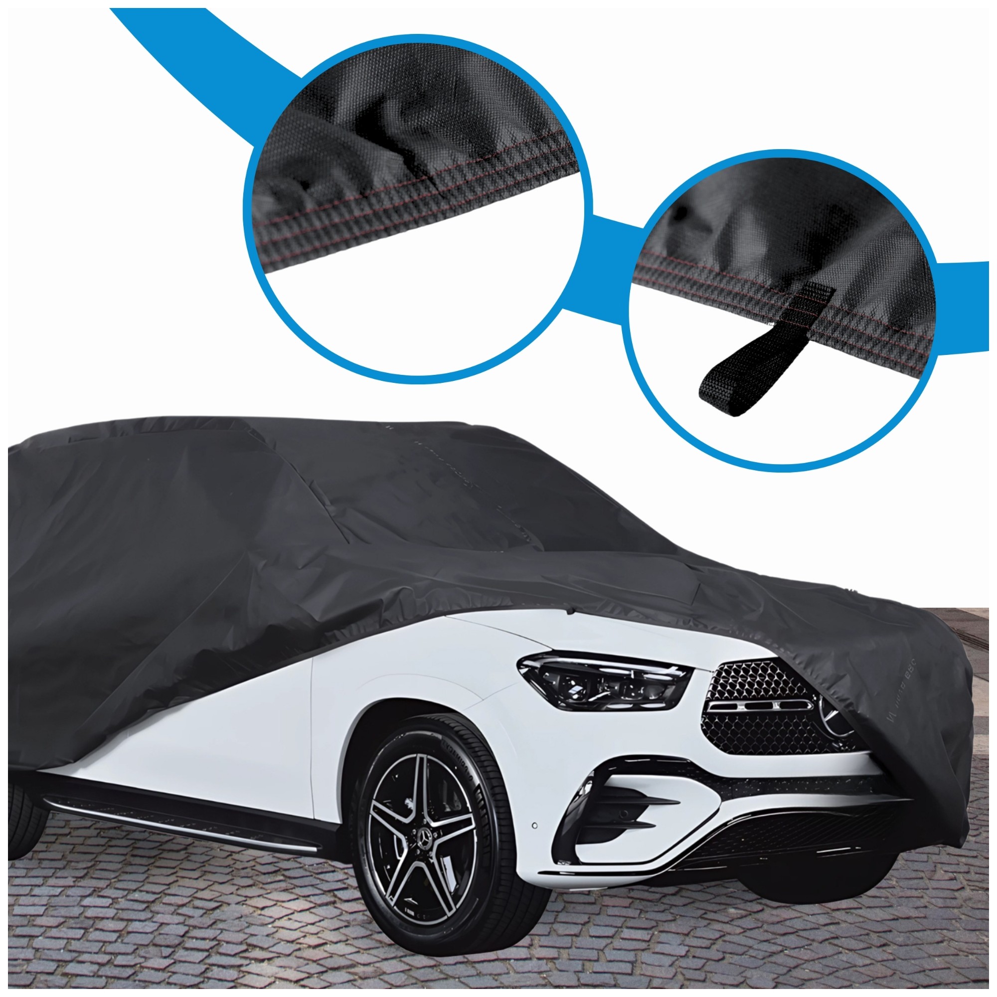 Pokrowiec wyposażony jest w wytrzymałą gumę ściągającą, która znajduje się w dolnej części, zapewniając stabilne i pewne mocowanie po obwodzie pokrowca. Dodatkowo, pokrowiec posiada oczka rozmieszczone w strategicznych miejscach obok kół auta, co umożliwia łatwe przypięcie plandeki za pomocą pasów stabilizujących (❗UWAGA❗ - Pasy dostępne do dokupienia na oddzielnych aukcjach). To rozwiązanie zapewnia jeszcze lepszą ochronę i pewność, że pokrowiec pozostanie na swoim miejscu, nawet w trudniejszych warunkach pogodowych.