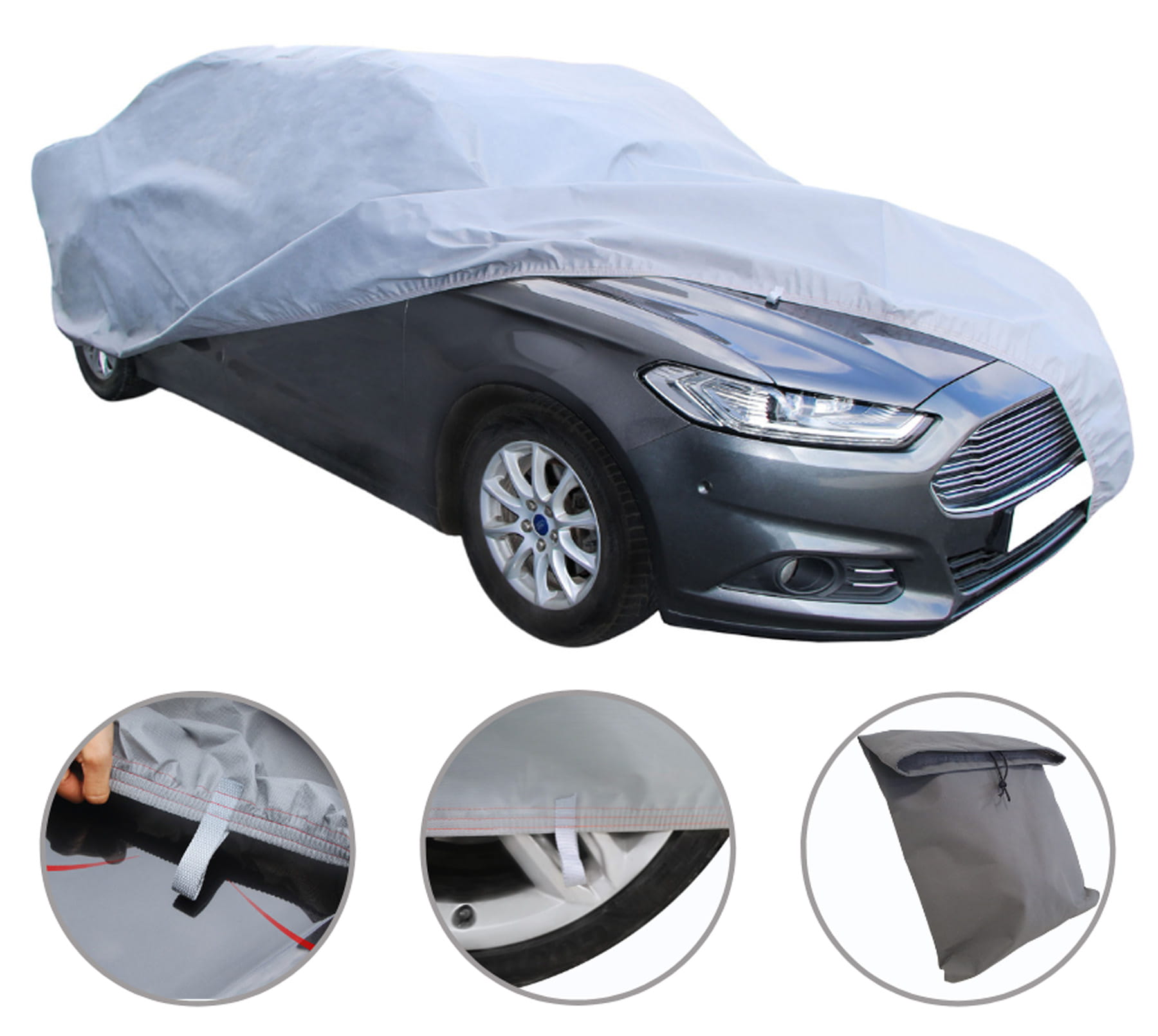 Pokrowiec wyposażony jest w wytrzymałą gumę ściągającą, która znajduje się w dolnej części, zapewniając stabilne i pewne mocowanie po obwodzie pokrowca. Dodatkowo, pokrowiec posiada oczka rozmieszczone w strategicznych miejscach obok kół auta, co umożliwia łatwe przypięcie plandeki za pomocą pasów stabilizujących (❗UWAGA❗ - Pasy dostępne do dokupienia na oddzielnych aukcjach). To rozwiązanie zapewnia jeszcze lepszą ochronę i pewność, że pokrowiec pozostanie na swoim miejscu, nawet w trudniejszych warunkach pogodowych.