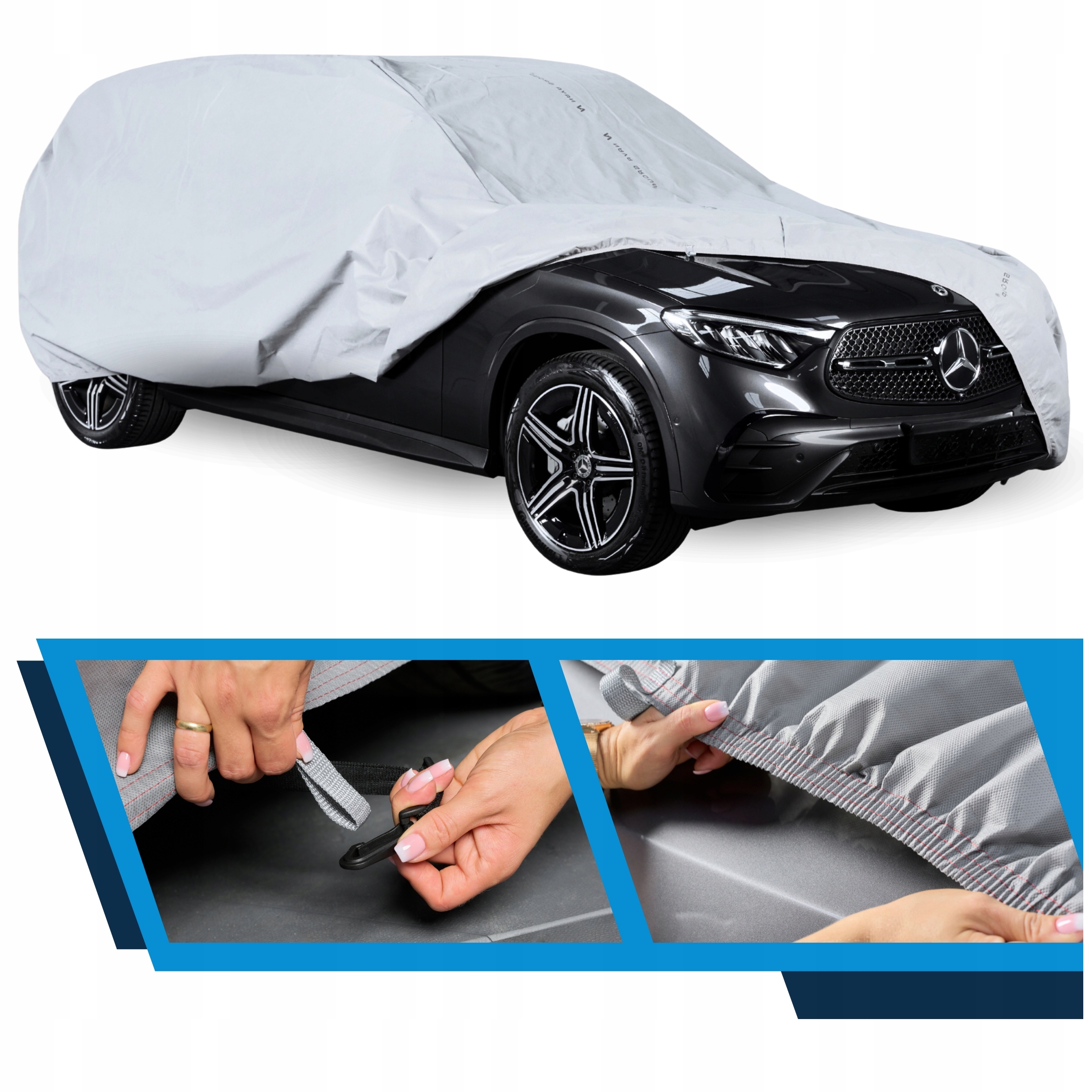 Pokrowiec wyposażony jest w wytrzymałą gumę ściągającą, która znajduje się w dolnej części, zapewniając stabilne i pewne mocowanie po obwodzie pokrowca. Dodatkowo, pokrowiec posiada oczka rozmieszczone w strategicznych miejscach obok kół auta, co umożliwia łatwe przypięcie plandeki za pomocą pasów stabilizujących. To rozwiązanie zapewnia jeszcze lepszą ochronę i pewność, że pokrowiec pozostanie na swoim miejscu, nawet w trudniejszych warunkach pogodowych.