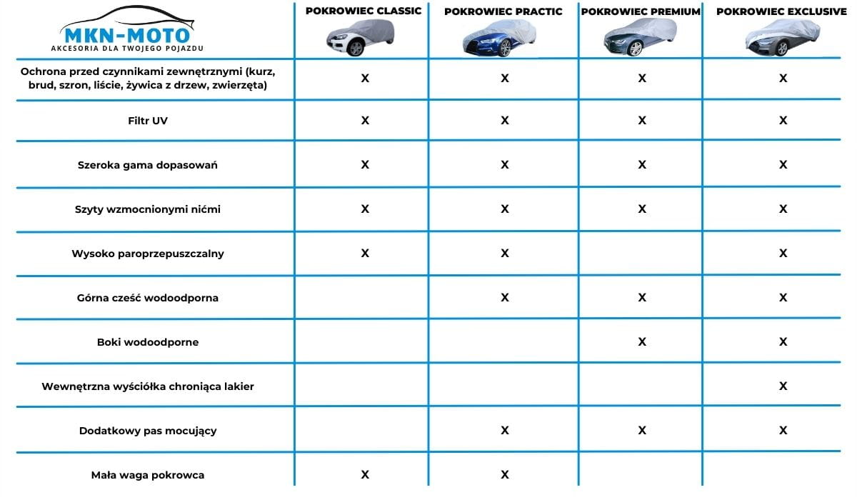 POKROWIEC PREMIUMWykonany z bezpiecznych dla lakieru materiałów, odpornych na niekorzystne warunki atmosferyczne. Bardzo wytrzymały a zarazem lekki. Pokrowiec w całości wodoodporny. Łatwe zakładanie oraz zdejmowanie pokrowca. Wyposażony w mocne gumy ściągające oraz oczka przy kołach. W zestawie znajdują się pasy stabilizujące pokrowiec. POKROWIEC WIELOSEZONOWY. Zimą zapobiega zamarzaniu szyb, natomiast latem zapobiega nadmiernemu nagrzewaniu się pojazdu. OCHRONA POJAZDU: przed działaniem promieniowania UV, przed deszczem, śniegiem, szronem, przed zwierzętami chodzącymi po pojeździe, przed żywicą, przed ptasimi odchodami, przed olejami i innymi substancjami, przed kurzem, rdzą i matowieniem lakieru pojazdu, przed wysokimi oraz niskimi temperaturami. Gwarancja 24-miesiące. KOLOR POKROWCA: popielaty. | |