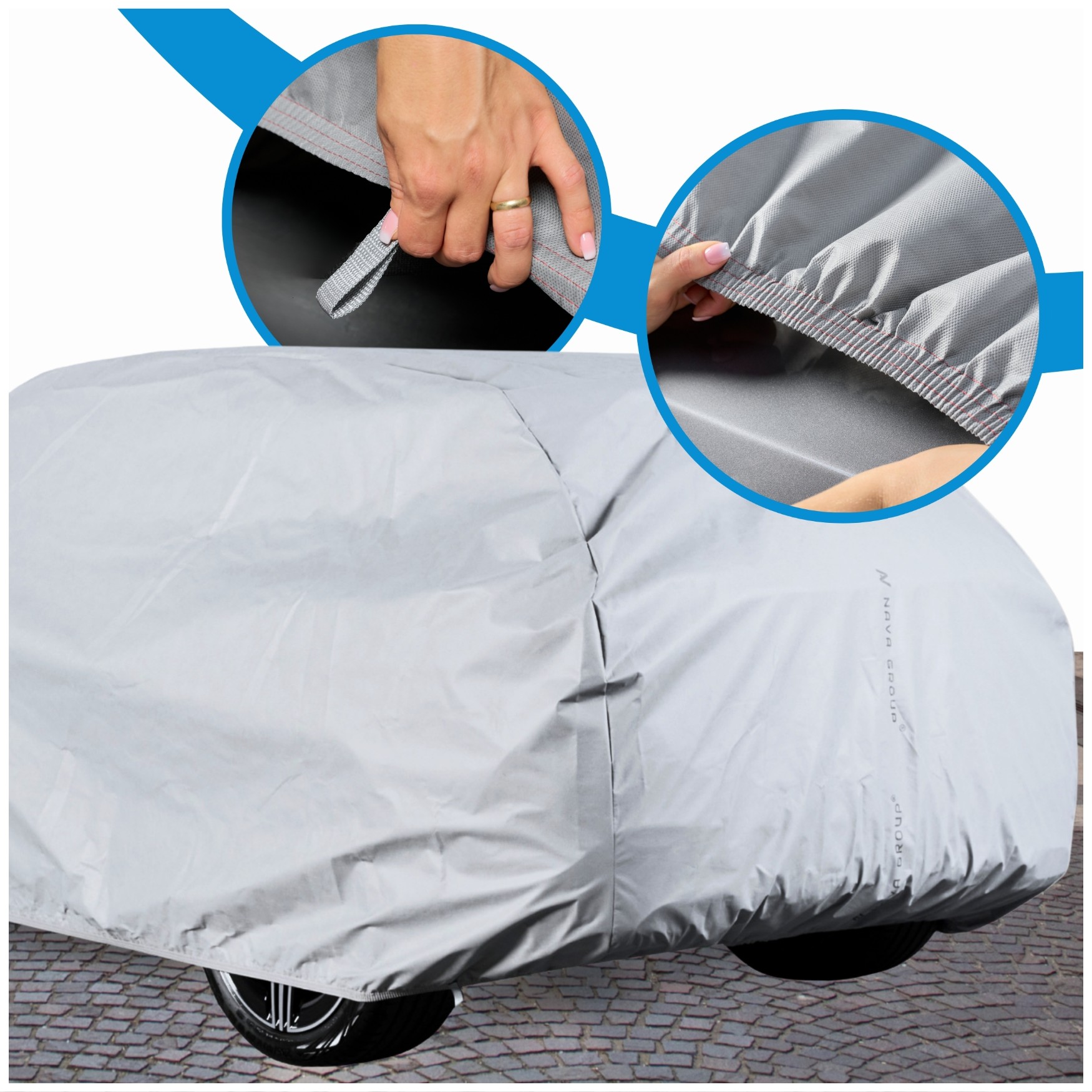Pokrowiec w kolorze szarym skutecznie odbija promienie słoneczne, zapobiegając przegrzewaniu się materiału i wnętrza pojazdu. Dodatkowo, zastosowany filtr UV zapewnia długotrwałą ochronę, bez efektu strzępienia i pękania materiału.