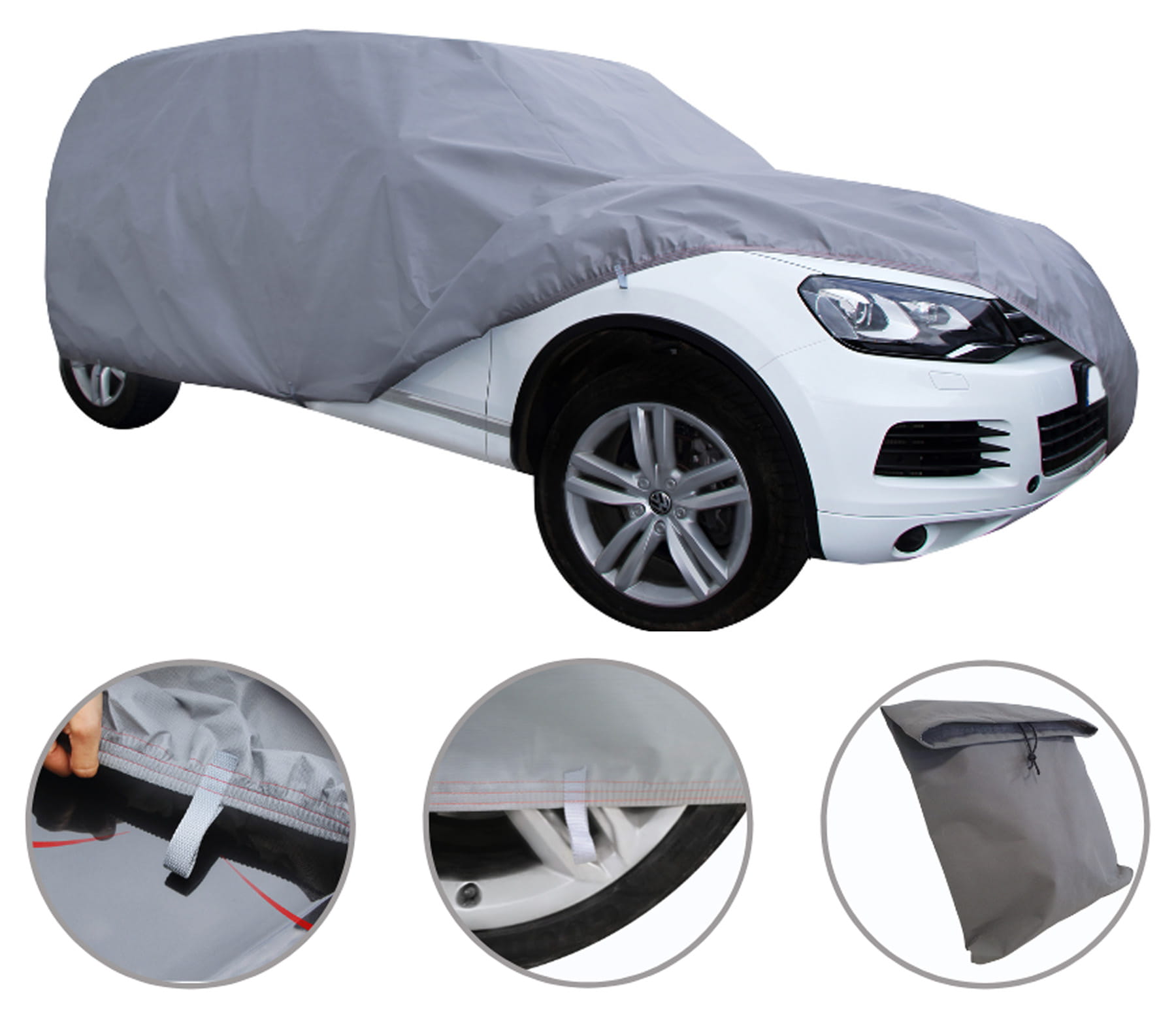 Pokrowiec w kolorze szarym skutecznie odbija promienie słoneczne, zapobiegając przegrzewaniu się materiału i wnętrza pojazdu. Dodatkowo, zastosowany filtr UV zapewnia długotrwałą ochronę, bez efektu strzępienia i pękania materiału.