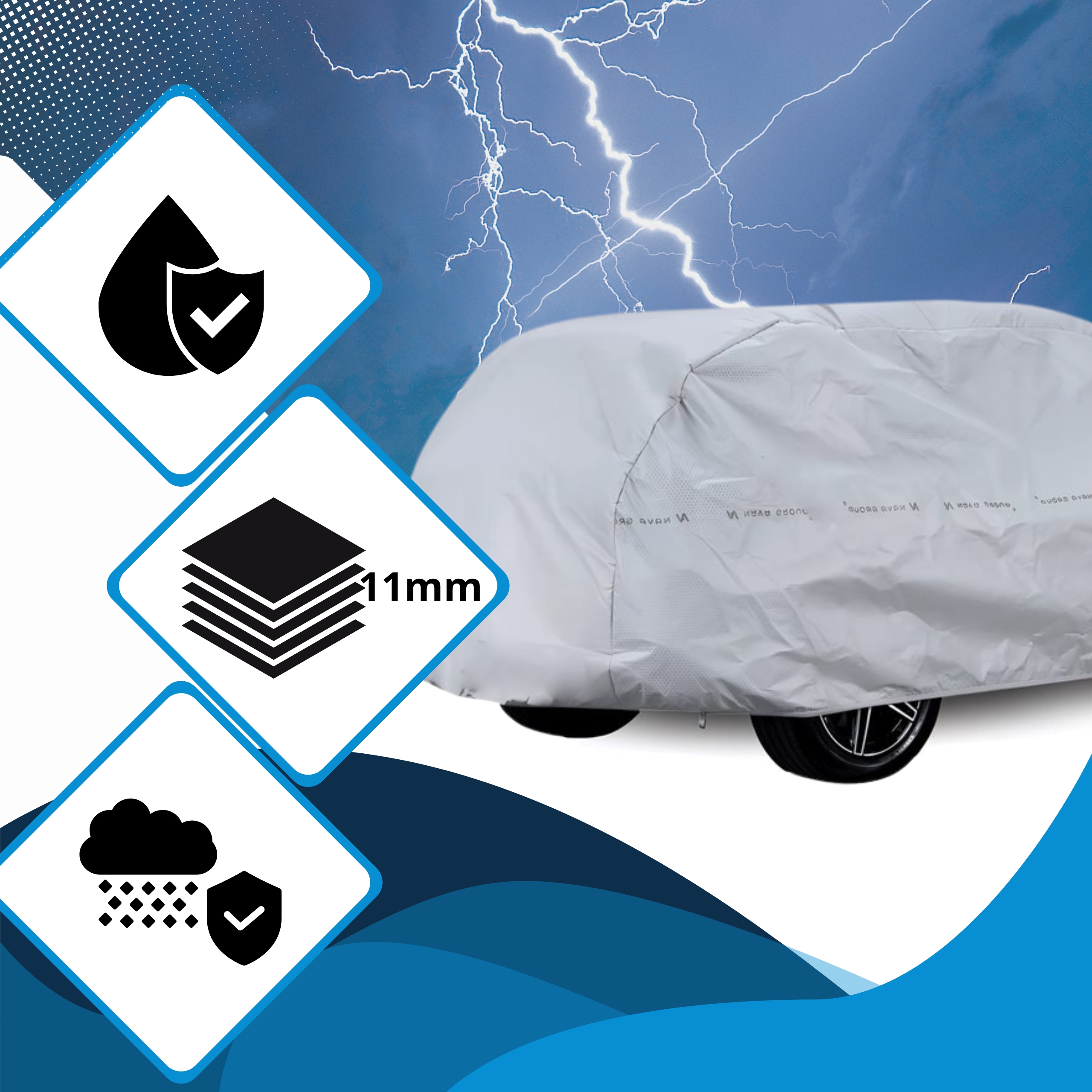 Nie ma nic bardziej stresującego niż widok nadciągającej burzy z gradem i myśl, co stanie się z autem zostawionym na zewnątrz. Pokrowiec przeciwgradowy to rozsądne zabezpieczenie, które może znacząco ograniczyć ryzyko uszkodzeń - daje Ci kontrolę i poczucie, że jesteś przygotowany. Zaprojektowany z myślą o SUV-ach, sedanach i hatchbackach – dostępny w różnych rozmiarach, by idealnie dopasować się do Twojego modelu.